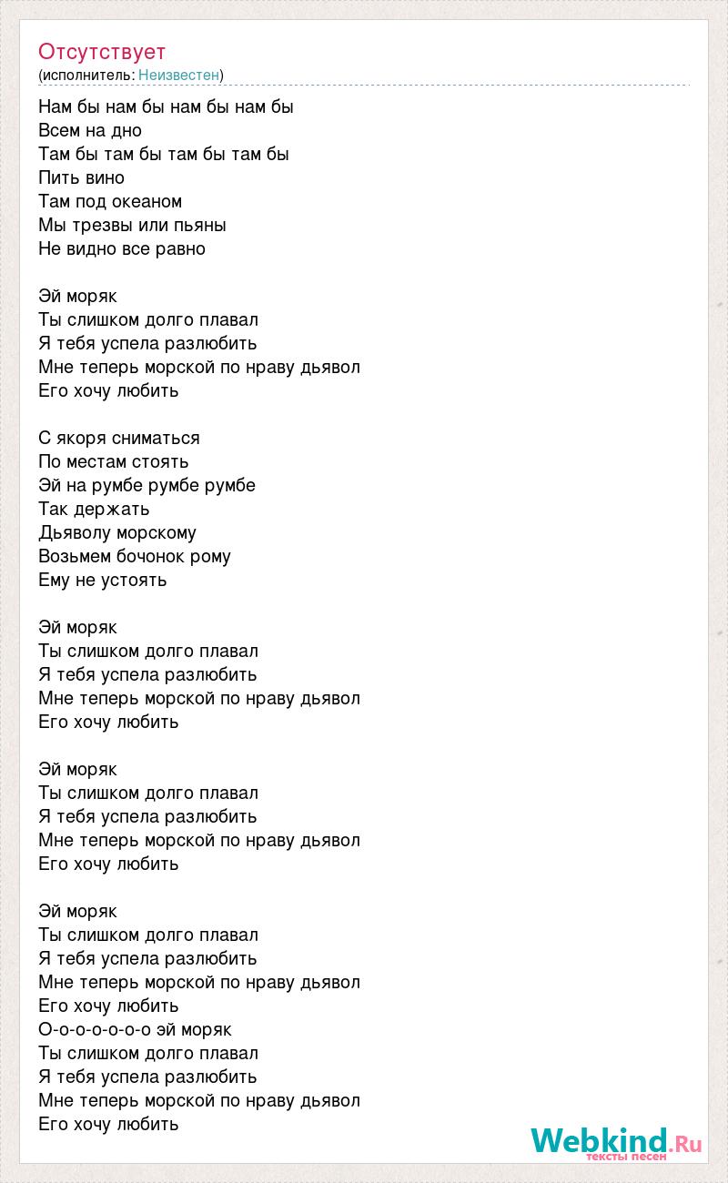 Нам бы нам бы нам бы нам бы Всем на дно Там бы там бы там бы там бы Пить вино Там под океаном Мы трезвы или пьяны Не видно все равно Эй моряк Ты слишком долго плавал Я тебя успела разлюбить Мне теперь морской по нраву дьявол Его хочу любить С якоря сниматься По местам стоять Эй на румбе румбе румбе Так держать Дьяволу морскому Возьмем бочонок рому Ему не устоять Эй моряк Ты слишком долго плавал Я тебя успела разлюбить Мне теперь морской по нраву дьявол Его хочу любить Эй моряк Ты слишком долго плавал Я тебя успела разлюбить Мне теперь морской по нраву дьявол Его хочу любить Эй моряк Ты слишком долго плавал Я тебя успела разлюбить Мне теперь морской по нраву дьявол Его хочу любить О-о-о-о-о-о-о эй моряк Ты слишком долго плавал Я тебя успела разлюбить Мне теперь морской по нраву дьявол Его хочу любить