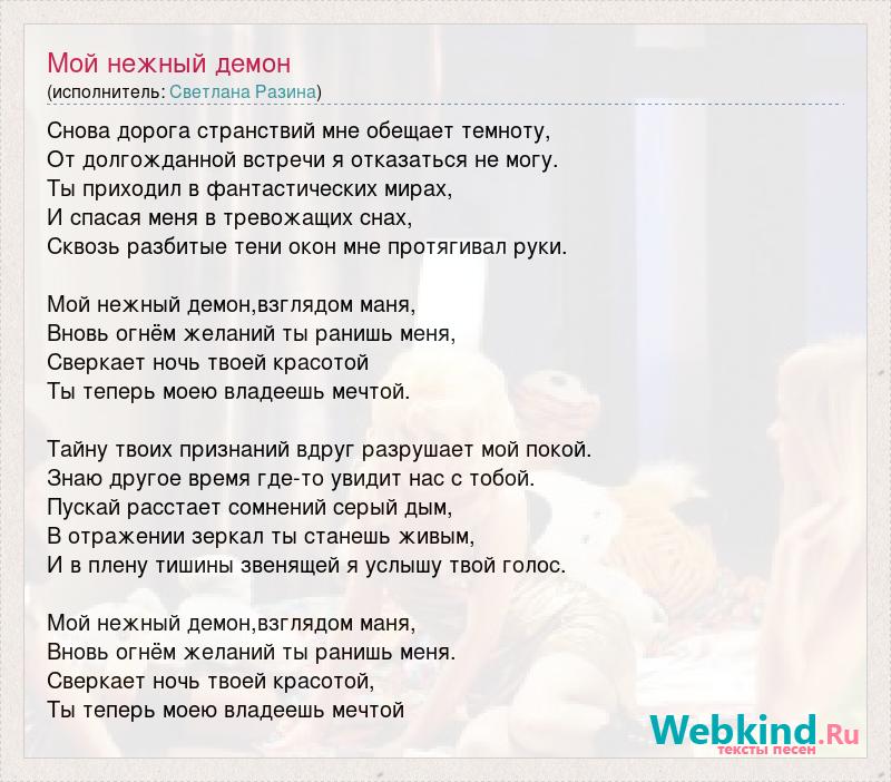 Снова дорога странствий мне обещает темноту, От долгожданной встречи я отказаться не могу. Ты приходил в фантастических мирах, И спасая меня в тревожащих снах, Сквозь разбитые тени окон мне протягивал руки. Мой нежный демон,взглядом маня, Вновь огнём желаний ты ранишь меня, Сверкает ночь твоей красотой Ты теперь моею владеешь мечтой. Тайну твоих признаний вдруг разрушает мой покой. Знаю другое время где-то увидит нас с тобой. Пускай расстает сомнений серый дым, В отражении зеркал ты станешь живым, И в плену тишины звенящей я услышу твой голос. Мой нежный демон,взглядом маня, Вновь огнём желаний ты ранишь меня. Сверкает ночь твоей красотой, Ты теперь моею владеешь мечтой