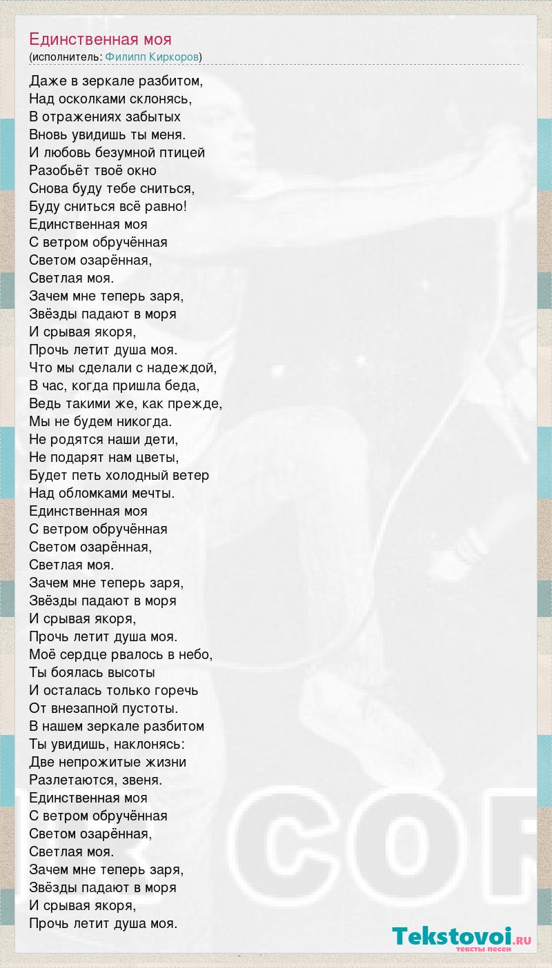 Даже в зеркале разбитом, Над осколками склонясь, В отражениях забытых Вновь увидишь ты меня. И любовь безумной птицей Разобьёт твоё окно Снова буду тебе сниться, Буду сниться всё равно! Единственная моя С ветром обручённая Светом озарённая, Светлая моя. Зачем мне теперь заря, Звёзды падают в моря И срывая якоря, Прочь летит душа моя. Что мы сделали с надеждой, В час, когда пришла беда, Ведь такими же, как прежде, Мы не будем никогда. Не родятся наши дети, Не подарят нам цветы, Будет петь холодный ветер Над обломками мечты. Единственная моя С ветром обручённая Светом озарённая, Светлая моя. Зачем мне теперь заря, Звёзды падают в моря И срывая якоря, Прочь летит душа моя. Моё сердце рвалось в небо, Ты боялась высоты И осталась только горечь От внезапной пустоты. В нашем зеркале разбитом Ты увидишь, наклонясь: Две непрожитые жизни Разлетаются, звеня. Единственная моя С ветром обручённая Светом озарённая, Светлая моя. Зачем мне теперь заря, Звёзды падают в моря И срывая якоря, Прочь летит душа моя.