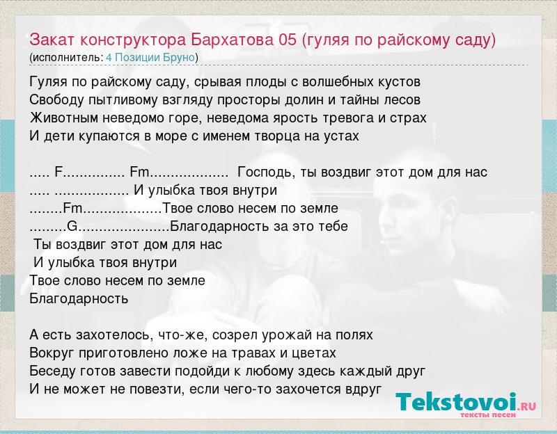 Гуляя по райскому саду, срывая плоды с волшебных кустов Свободу пытливому взгляду просторы долин и тайны лесов Животным неведомо горе, неведома ярость тревога и страх И дети купаются в море с именем творца на устах ..... F............... Fm................... Господь, ты воздвиг этот дом для нас ..... .................. И улыбка твоя внутри ........Fm...................Твое слово несем по земле .........G......................Благодарность за это тебе Ты воздвиг этот дом для нас И улыбка твоя внутри Твое слово несем по земле Благодарность А есть захотелось, что-же, созрел урожай на полях Вокруг приготовлено ложе на травах и цветах Беседу готов завести подойди к любому здесь каждый друг И не может не повезти, если чего-то захочется вдруг
