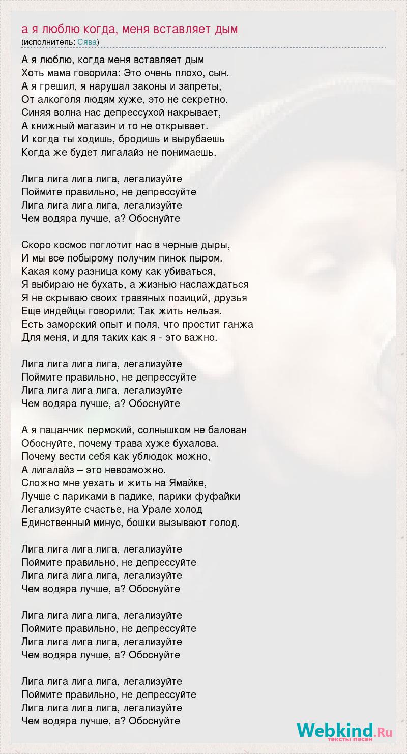 А я люблю, когда меня вставляет дым Хоть мама говорила: Это очень плохо, сын. А я грешил, я нарушал законы и запреты, От алкоголя людям хуже, это не секретно. Синяя волна нас депрессухой накрывает, А книжный магазин и то не открывает. И когда ты ходишь, бродишь и вырубаешь Когда же будет лигалайз не понимаешь. Лига лига лига лига, легализуйте Поймите правильно, не депрессуйте Лига лига лига лига, легализуйте Чем водяра лучше, а? Обоснуйте Скоро космос поглотит нас в черные дыры, И мы все побырому получим пинок пыром. Какая кому разница кому как убиваться, Я выбираю не бухать, а жизнью наслаждаться Я не скрываю своих травяных позиций, друзья Еще индейцы говорили: Так жить нельзя. Есть заморский опыт и поля, что простит ганжа Для меня, и для таких как я - это важно. Лига лига лига лига, легализуйте Поймите правильно, не депрессуйте Лига лига лига лига, легализуйте Чем водяра лучше, а? Обоснуйте А я пацанчик пермский, солнышком не балован Обоснуйте, почему трава хуже бухалова. Почему вести себя как ублюдок можно, А лигалайз – это невозможно. Сложно мне уехать и жить на Ямайке, Лучше с париками в падике, парики фуфайки Легализуйте счастье, на Урале холод Единственный минус, бошки вызывают голод. Лига лига лига лига, легализуйте Поймите правильно, не депрессуйте Лига лига лига лига, легализуйте Чем водяра лучше, а? Обоснуйте Лига лига лига лига, легализуйте Поймите правильно, не депрессуйте Лига лига лига лига, легализуйте Чем водяра лучше, а? Обоснуйте Лига лига лига лига, легализуйте Поймите правильно, не депрессуйте Лига лига лига лига, легализуйте Чем водяра лучше, а? Обоснуйте