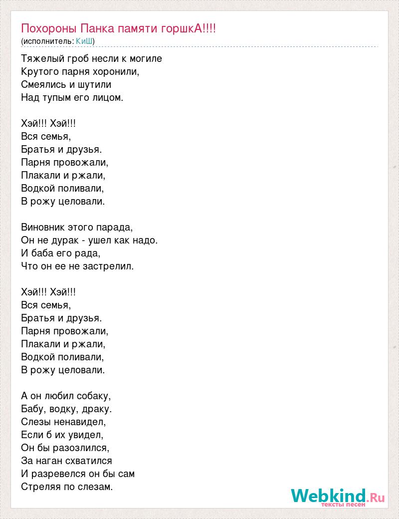 Тяжелый гроб несли к могиле Крутого парня хоронили, Смеялись и шутили Над тупым его лицом. Хэй!!! Хэй!!! Вся семья, Братья и друзья. Парня провожали, Плакали и ржали, Водкой поливали, В рожу целовали. Виновник этого парада, Он не дурак - ушел как надо. И баба его рада, Что он ее не застрелил. Хэй!!! Хэй!!! Вся семья, Братья и друзья. Парня провожали, Плакали и ржали, Водкой поливали, В рожу целовали. А он любил собаку, Бабу, водку, драку. Слезы ненавидел, Если б их увидел, Он бы разозлился, За наган схватился И разревелся он бы сам Стреляя по слезам.