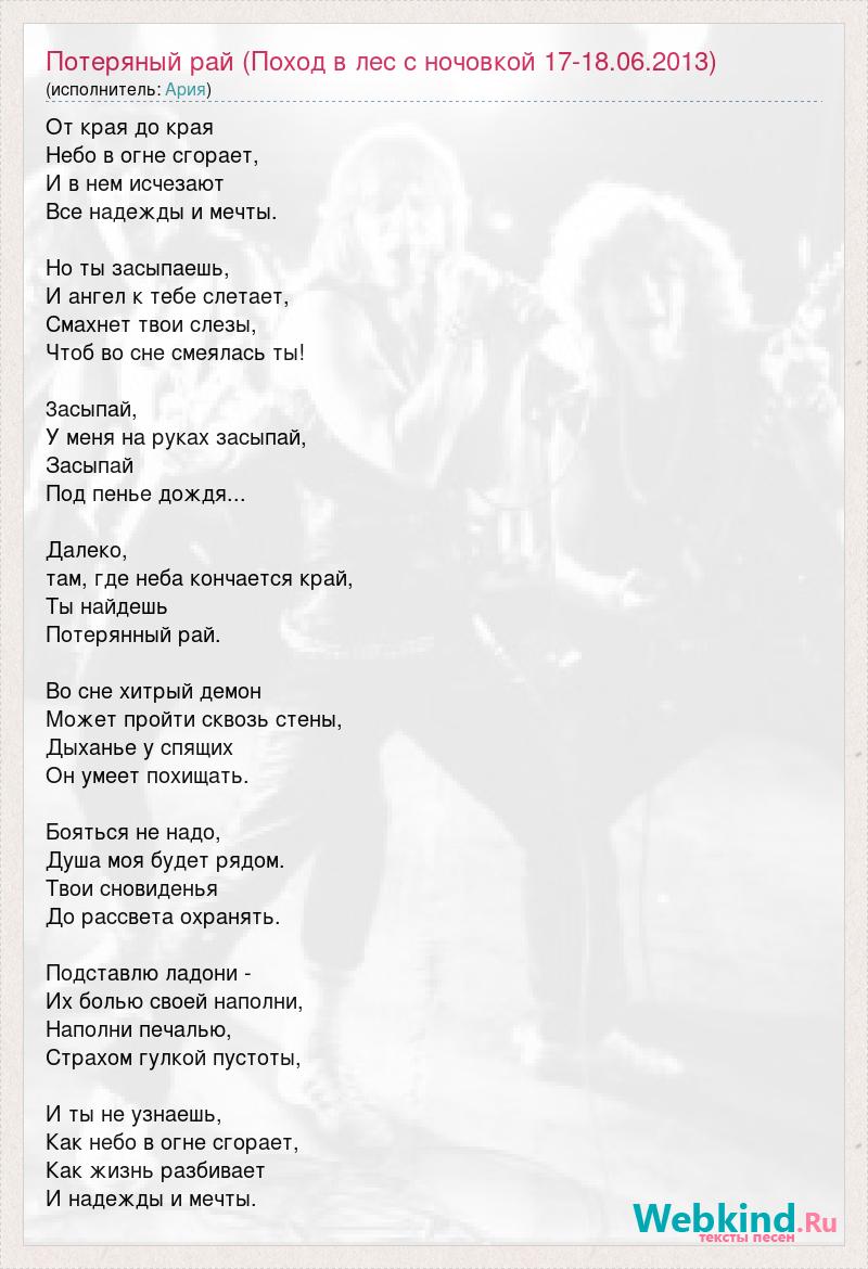 От края до края Небо в огне сгорает, И в нем исчезают Все надежды и мечты. Но ты засыпаешь, И ангел к тебе слетает, Смахнет твои слезы, Чтоб во сне смеялась ты! 3асыпай, У меня на руках засыпай, Засыпай Под пенье дождя... Далеко, там, где неба кончается край, Ты найдешь Потерянный рай. Во сне хитрый демон Может пройти сквозь стены, Дыханье у спящих Он умеет похищать. Бояться не надо, Душа моя будет рядом. Твои сновиденья До рассвета охранять. Подставлю ладони - Их болью своей наполни, Наполни печалью, Страхом гулкой пустоты, И ты не узнаешь, Как небо в огне сгорает, Как жизнь разбивает И надежды и мечты.