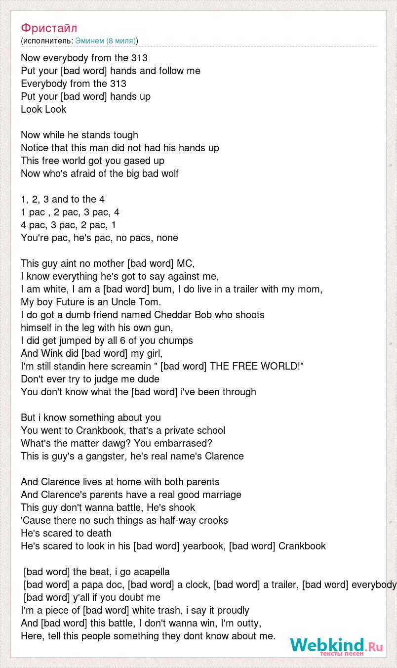 Now everybody from the 313 Put your [bad word] hands and follow me Everybody from the 313 Put your [bad word] hands up Look Look Now while he stands tough Notice that this man did not had his hands up This free world got you gased up Now who's afraid of the big bad wolf 1, 2, 3 and to the 4 1 pac , 2 pac, 3 pac, 4 4 pac, 3 pac, 2 pac, 1 You're pac, he's pac, no pacs, none This guy aint no mother [bad word] MC, I know everything he's got to say against me, I am white, I am a [bad word] bum, I do live in a trailer with my mom, My boy Future is an Uncle Tom. I do got a dumb friend named Cheddar Bob who shoots himself in the leg with his own gun, I did get jumped by all 6 of you chumps And Wink did [bad word] my girl, I'm still standin here screamin " [bad word] THE FREE WORLD!" Don't ever try to judge me dude You don't know what the [bad word] i've been through But i know something about you You went to Crankbook, that's a private school What's the matter dawg? You embarrased? This is guy's a gangster, he's real name's Clarence And Clarence lives at home with both parents And Clarence's parents have a real good marriage This guy don't wanna battle, He's shook 'Cause there no such things as half-way crooks He's scared to death He's scared to look in his [bad word] yearbook, [bad word] Crankbook [bad word] the beat, i go acapella [bad word] a papa doc, [bad word] a clock, [bad word] a trailer, [bad word] everybody [bad word] y'all if you doubt me I'm a piece of [bad word] white trash, i say it proudly And [bad word] this battle, I don't wanna win, I'm outty, Here, tell this people something they dont know about me.