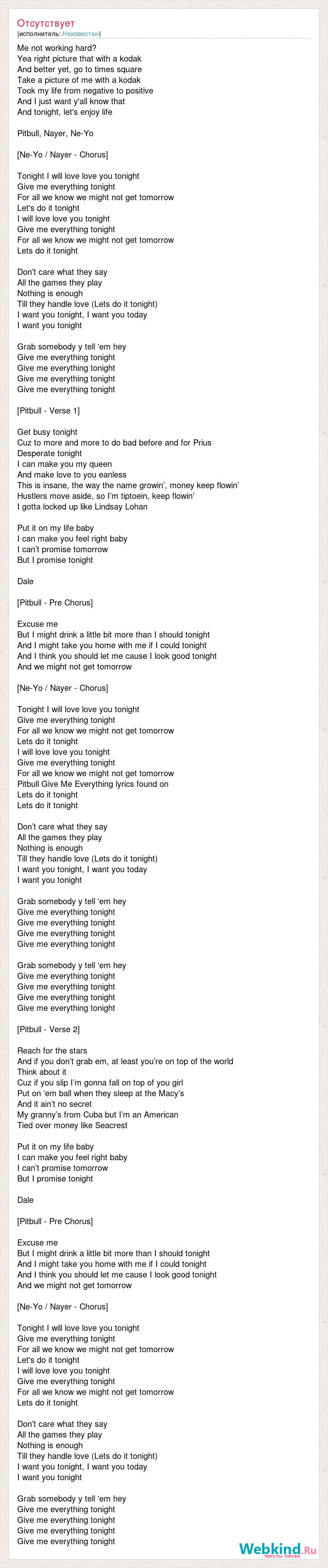 Me not working hard? Yea right picture that with a kodak And better yet, go to times square Take a picture of me with a kodak Took my life from negative to positive And I just want y'all know that And tonight, let's enjoy life Pitbull, Nayer, Ne-Yo [Ne-Yo / Nayer - Chorus] Tonight I will love love you tonight Give me everything tonight For all we know we might not get tomorrow Let's do it tonight I will love love you tonight Give me everything tonight For all we know we might not get tomorrow Lets do it tonight Don’t care what they say All the games they play Nothing is enough Till they handle love (Lets do it tonight) I want you tonight, I want you today I want you tonight Grab somebody y tell ‘em hey Give me everything tonight Give me everything tonight Give me everything tonight Give me everything tonight [Pitbull - Verse 1] Get busy tonight Cuz to more and more to do bad before and for Prius Desperate tonight I can make you my queen And make love to you eanless This is insane, the way the name growin’, money keep flowin’ Hustlers move aside, so I’m tiptoein, keep flowin’ I gotta locked up like Lindsay Lohan Put it on my life baby I can make you feel right baby I can’t promise tomorrow But I promise tonight Dale [Pitbull - Pre Chorus] Excuse me But I might drink a little bit more than I should tonight And I might take you home with me if I could tonight And I think you should let me cause I look good tonight And we might not get tomorrow [Ne-Yo / Nayer - Chorus] Tonight I will love love you tonight Give me everything tonight For all we know we might not get tomorrow Lets do it tonight I will love love you tonight Give me everything tonight For all we know we might not get tomorrow Pitbull Give Me Everything lyrics found on Lets do it tonight Lets do it tonight Don’t care what they say All the games they play Nothing is enough Till they handle love (Lets do it tonight) I want you tonight, I want you today I want you tonight Grab somebody y tell ‘em hey Give me everything tonight Give me everything tonight Give me everything tonight Give me everything tonight Grab somebody y tell ‘em hey Give me everything tonight Give me everything tonight Give me everything tonight Give me everything tonight [Pitbull - Verse 2] Reach for the stars And if you don’t grab em, at least you’re on top of the world Think about it Cuz if you slip I’m gonna fall on top of you girl Put on ‘em ball when they sleep at the Macy’s And it ain’t no secret My granny’s from Cuba but I’m an American Tied over money like Seacrest Put it on my life baby I can make you feel right baby I can’t promise tomorrow But I promise tonight Dale [Pitbull - Pre Chorus] Excuse me But I might drink a little bit more than I should tonight And I might take you home with me if I could tonight And I think you should let me cause I look good tonight And we might not get tomorrow [Ne-Yo / Nayer - Chorus] Tonight I will love love you tonight Give me everything tonight For all we know we might not get tomorrow Let's do it tonight I will love love you tonight Give me everything tonight For all we know we might not get tomorrow Lets do it tonight Don’t care what they say All the games they play Nothing is enough Till they handle love (Lets do it tonight) I want you tonight, I want you today I want you tonight Grab somebody y tell ‘em hey Give me everything tonight Give me everything tonight Give me everything tonight Give me everything tonight