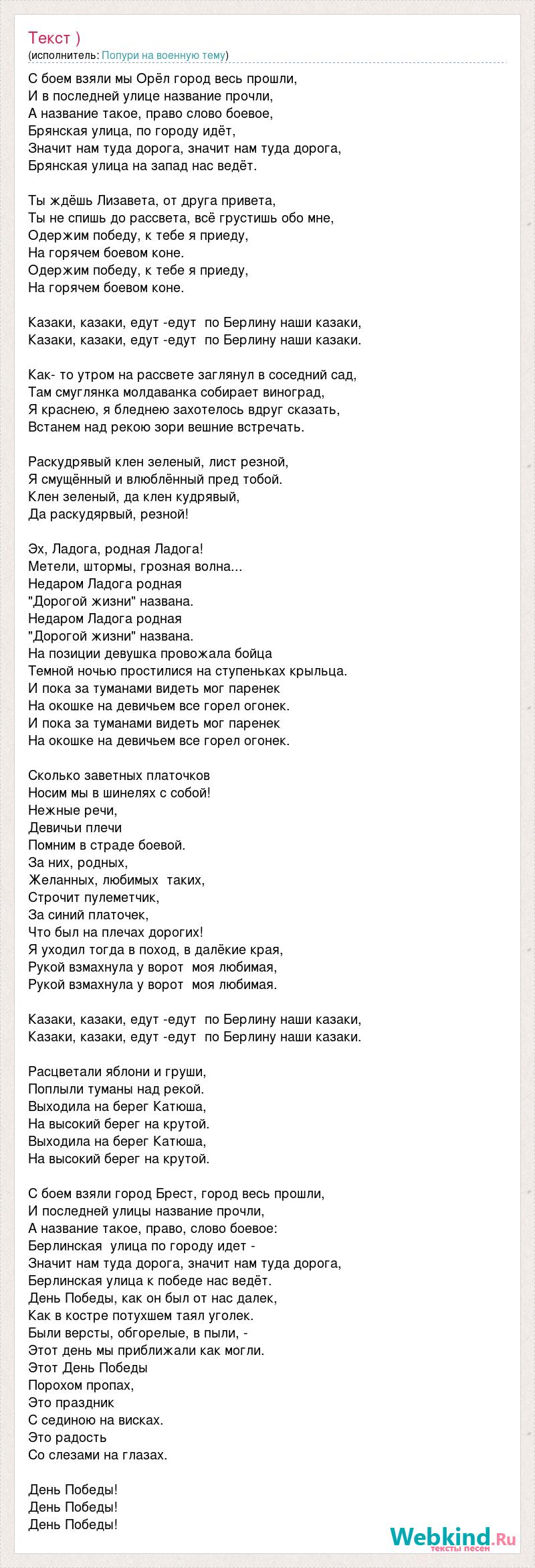 С боем взяли мы Орёл город весь прошли, И в последней улице название прочли, А название такое, право слово боевое, Брянская улица, по городу идёт, Значит нам туда дорога, значит нам туда дорога, Брянская улица на запад нас ведёт. Ты ждёшь Лизавета, от друга привета, Ты не спишь до рассвета, всё грустишь обо мне, Одержим победу, к тебе я приеду, На горячем боевом коне. Одержим победу, к тебе я приеду, На горячем боевом коне. Казаки, казаки, едут -едут по Берлину наши казаки, Казаки, казаки, едут -едут по Берлину наши казаки. Как- то утром на рассвете заглянул в соседний сад, Там смуглянка молдаванка собирает виноград, Я краснею, я бледнею захотелось вдруг сказать, Встанем над рекою зори вешние встречать. Раскудрявый клен зеленый, лист резной, Я смущённый и влюблённый пред тобой. Клен зеленый, да клен кудрявый, Да раскудярвый, резной! Эх, Ладога, родная Ладога! Метели, штормы, грозная волна... Недаром Ладога родная "Дорогой жизни" названа. Недаром Ладога родная "Дорогой жизни" названа. На позиции девушка провожала бойца Темной ночью простилися на ступеньках крыльца. И пока за туманами видеть мог паренек На окошке на девичьем все горел огонек. И пока за туманами видеть мог паренек На окошке на девичьем все горел огонек. Сколько заветных платочков Носим мы в шинелях с собой! Нежные речи, Девичьи плечи Помним в страде боевой. За них, родных, Желанных, любимых таких, Строчит пулеметчик, За синий платочек, Что был на плечах дорогих! Я уходил тогда в поход, в далёкие края, Рукой взмахнула у ворот моя любимая, Рукой взмахнула у ворот моя любимая. Казаки, казаки, едут -едут по Берлину наши казаки, Казаки, казаки, едут -едут по Берлину наши казаки. Расцветали яблони и груши, Поплыли туманы над рекой. Выходила на берег Катюша, На высокий берег на крутой. Выходила на берег Катюша, На высокий берег на крутой. С боем взяли город Брест, город весь прошли, И последней улицы название прочли, А название такое, право, слово боевое: Берлинская улица по городу идет - Значит нам туда дорога, значит нам туда дорога, Берлинская улица к победе нас ведёт. День Победы, как он был от нас далек, Как в костре потухшем таял уголек. Были версты, обгорелые, в пыли, - Этот день мы приближали как могли. Этот День Победы Порохом пропах, Это праздник С сединою на висках. Это радость Со слезами на глазах. День Победы! День Победы! День Победы!