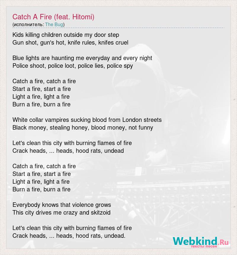 Kids killing children outside my door step Gun shot, gun's hot, knife rules, knifes cruel Blue lights are haunting me everyday and every night Police shoot, police loot, police lies, police spy Catch a fire, catch a fire Start a fire, start a fire Light a fire, light a fire Burn a fire, burn a fire White collar vampires sucking blood from London streets Black money, stealing honey, blood money, not funny Let's clean this city with burning flames of fire Crack heads, ... heads, hood rats, undead Catch a fire, catch a fire Start a fire, start a fire Light a fire, light a fire Burn a fire, burn a fire Everybody knows that violence grows This city drives me crazy and skitzoid Let's clean this city with burning flames of fire Crack heads, ... heads, hood rats, undead.