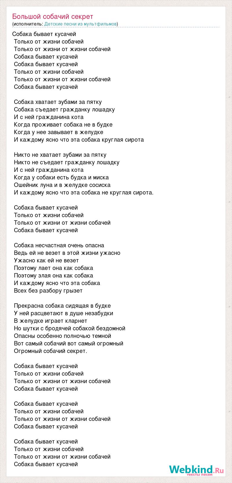 Собака бывает кусачей Только от жизни собачей Только от жизни от жизни собачей Собака бывает кусачей Собака бывает кусачей Только от жизни собачей Только от жизни от жизни собачей Собака бывает кусачей Собака хватает зубами за пятку Собака съедает гражданку лошадку И с ней гражданина кота Когда проживает собака не в будке Когда у нее завывает в желудке И каждому ясно что эта собака круглая сирота Никто не хватает зубами за пятку Никто не съедает гражданку лошадку И с ней гражданина кота Когда у собаки есть будка и миска Ошейник луна и в желудке сосиска И каждому ясно что эта собака не круглая сирота. Собака бывает кусачей Только от жизни собачей Только от жизни от жизни собачей Собака бывает кусачей Собака несчастная очень опасна Ведь ей не везет в этой жизни ужасно Ужасно как ей не везет Поэтому лает она как собака Поэтому злая она как собака И каждому ясно что эта собака Всех без разбору грызет Прекрасна собака сидящая в будке У ней расцветают в душе незабудки В желудке играет кларнет Но шутки с бродячей собакой бездомной Опасны особенно полночью темной Вот самый собачий вот самый огромный Огромный собачий секрет. Собака бывает кусачей Только от жизни собачей Только от жизни от жизни собачей Собака бывает кусачей Собака бывает кусачей Только от жизни собачей Только от жизни от жизни собачей Собака бывает кусачей Собака бывает кусачей Только от жизни собачей Только от жизни от жизни собачей Собака бывает кусачей