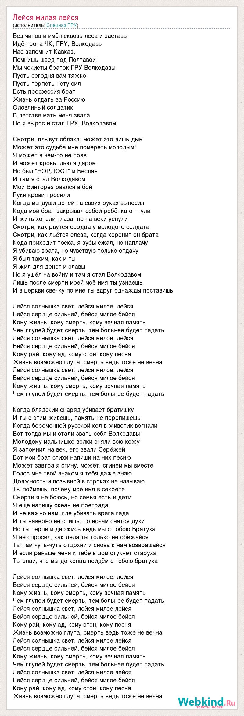Без чинов и имён сквозь леса и заставы Идёт рота ЧК, ГРУ, Волкодавы Нас запомнит Кавказ, Помнишь швед под Полтавой Мы чекисты браток ГРУ Волкодавы Пусть сегодня вам тяжко Пусть терпеть нету сил Есть профессия брат Жизнь отдать за Россию Оловянный солдатик В детстве мать меня звала Но я вырос и стал ГРУ, Волкодавом Смотри, плывут облака, может это лишь дым Может это судьба мне помереть молодым! Я может в чём-то не прав И может кровь, лью я даром Но был "НОРДОСТ" и Беслан И там я стал Волкодавом Мой Винторез рвался в бой Руки крови просили Когда мы души детей на своих руках выносил Кода мой брат закрывал собой ребёнка от пули И жить хотели глаза, но на веки уснули Смотри, как рвутся сердца у молодого солдата Смотри, как льётся слеза, когда хоронит он брата Кода приходит тоска, я зубы сжал, но наплачу Я убиваю врага, но чувствую только отдачу Я был таким, как и ты Я жил для денег и славы Но я ушёл на войну и там я стал Волкодавом Лишь после смерти моей моё имя ты узнаешь И в церкви свечку по мне ты вдруг однажды поставишь Лейся солнышка свет, лейся милое, лейся Бейся сердце сильней, бейся милое бейся Кому жизнь, кому смерть, кому вечная память Чем глупей будет смерть, тем больнее будет падать Лейся солнышка свет, лейся милое, лейся Бейся сердце сильней, бейся милое бейся Кому рай, кому ад, кому стон, кому песня Жизнь возможно глупа, смерть ведь тоже не вечна Лейся солнышка свет, лейся милое, лейся Бейся сердце сильней, бейся милое бейся Кому жизнь, кому смерть, кому вечная память Чем глупей будет смерть, тем больнее будет падать Когда блядский снаряд убивает братишку И ты с этим живешь, память не перепишешь Когда беременной русской кол в животик вогнали Вот тогда мы и стали звать себя Волкодавы Молодому мальчишке волки сняли всю кожу Я запомнил на век, его звали Серёжей Вот мои брат стихи напиши на них песню Может завтра я сгину, может, сгинем мы вместе Голос мне твой знаком я тебя даже знаю Должность и позывной в строках не называю Ты поймешь, почему моё имя в секрете Смерти я не боюсь, но семья есть и дети Я ещё напишу океан не преграда И не важно нам, где убивать врага гада И ты наверно не спишь, по ночам снятся духи Но ты терпи и держись ведь мы с тобою Братуха Я не спросил, как дела ты только не обижайся Ты там чуть-чуть отдохни и снова к нам возвращайся И если раньше меня к тебе в дом стукнет старуха Ты знай, что мы до конца пойдём с тобою братуха Лейся солнышка свет, лейся милое, лейся Бейся сердце сильней, бейся милое бейся Кому жизнь, кому смерть, кому вечная память Чем глупей будет смерть, тем больнее будет падать Лейся солнышка свет, лейся милое лейся Бейся сердце сильней, бейся милое бейся Кому рай, кому ад, кому стон, кому песня Жизнь возможно глупа, смерть ведь тоже не вечна Лейся солнышка свет, лейся милое лейся Бейся сердце сильней, бейся милое бейся Кому жизнь, кому смерть, кому вечная память Чем глупей будет смерть, тем больнее будет падать Лейся солнышка свет, лейся милое лейся Бейся сердце сильней, бейся милое бейся Кому рай, кому ад, кому стон, кому песня Жизнь возможно глупа, смерть ведь тоже не вечна