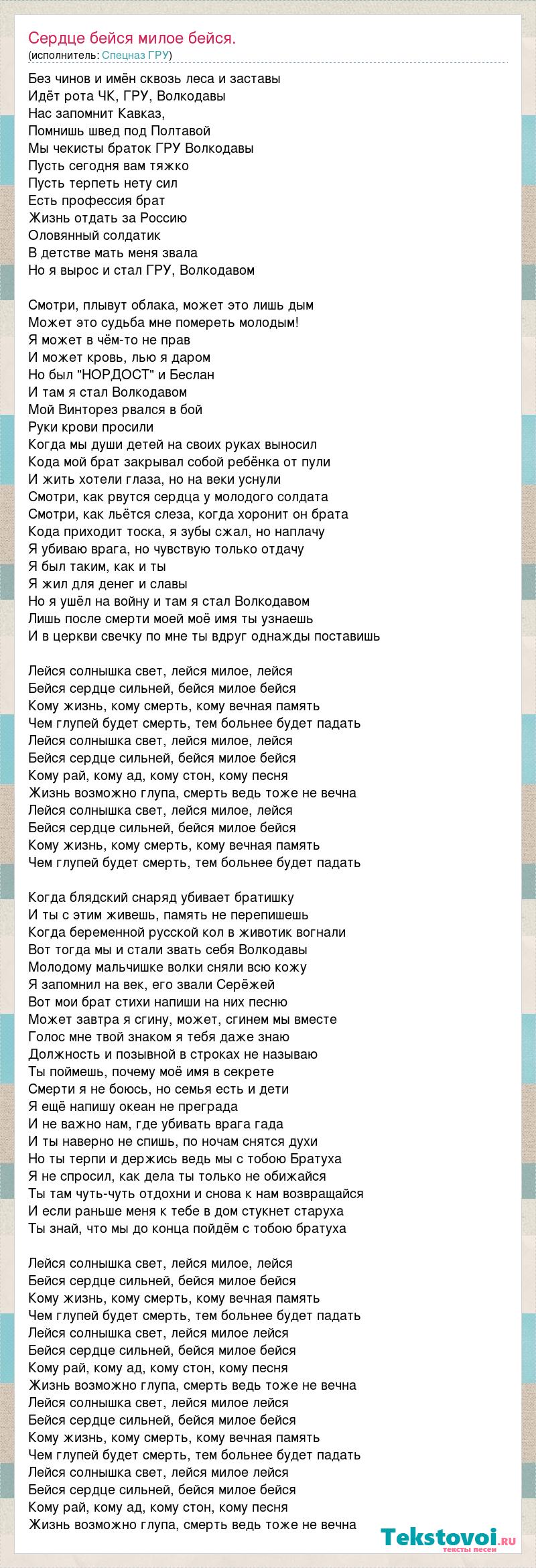 Без чинов и имён сквозь леса и заставы Идёт рота ЧК, ГРУ, Волкодавы Нас запомнит Кавказ, Помнишь швед под Полтавой Мы чекисты браток ГРУ Волкодавы Пусть сегодня вам тяжко Пусть терпеть нету сил Есть профессия брат Жизнь отдать за Россию Оловянный солдатик В детстве мать меня звала Но я вырос и стал ГРУ, Волкодавом Смотри, плывут облака, может это лишь дым Может это судьба мне помереть молодым! Я может в чём-то не прав И может кровь, лью я даром Но был "НОРДОСТ" и Беслан И там я стал Волкодавом Мой Винторез рвался в бой Руки крови просили Когда мы души детей на своих руках выносил Кода мой брат закрывал собой ребёнка от пули И жить хотели глаза, но на веки уснули Смотри, как рвутся сердца у молодого солдата Смотри, как льётся слеза, когда хоронит он брата Кода приходит тоска, я зубы сжал, но наплачу Я убиваю врага, но чувствую только отдачу Я был таким, как и ты Я жил для денег и славы Но я ушёл на войну и там я стал Волкодавом Лишь после смерти моей моё имя ты узнаешь И в церкви свечку по мне ты вдруг однажды поставишь Лейся солнышка свет, лейся милое, лейся Бейся сердце сильней, бейся милое бейся Кому жизнь, кому смерть, кому вечная память Чем глупей будет смерть, тем больнее будет падать Лейся солнышка свет, лейся милое, лейся Бейся сердце сильней, бейся милое бейся Кому рай, кому ад, кому стон, кому песня Жизнь возможно глупа, смерть ведь тоже не вечна Лейся солнышка свет, лейся милое, лейся Бейся сердце сильней, бейся милое бейся Кому жизнь, кому смерть, кому вечная память Чем глупей будет смерть, тем больнее будет падать Когда блядский снаряд убивает братишку И ты с этим живешь, память не перепишешь Когда беременной русской кол в животик вогнали Вот тогда мы и стали звать себя Волкодавы Молодому мальчишке волки сняли всю кожу Я запомнил на век, его звали Серёжей Вот мои брат стихи напиши на них песню Может завтра я сгину, может, сгинем мы вместе Голос мне твой знаком я тебя даже знаю Должность и позывной в строках не называю Ты поймешь, почему моё имя в секрете Смерти я не боюсь, но семья есть и дети Я ещё напишу океан не преграда И не важно нам, где убивать врага гада И ты наверно не спишь, по ночам снятся духи Но ты терпи и держись ведь мы с тобою Братуха Я не спросил, как дела ты только не обижайся Ты там чуть-чуть отдохни и снова к нам возвращайся И если раньше меня к тебе в дом стукнет старуха Ты знай, что мы до конца пойдём с тобою братуха Лейся солнышка свет, лейся милое, лейся Бейся сердце сильней, бейся милое бейся Кому жизнь, кому смерть, кому вечная память Чем глупей будет смерть, тем больнее будет падать Лейся солнышка свет, лейся милое лейся Бейся сердце сильней, бейся милое бейся Кому рай, кому ад, кому стон, кому песня Жизнь возможно глупа, смерть ведь тоже не вечна Лейся солнышка свет, лейся милое лейся Бейся сердце сильней, бейся милое бейся Кому жизнь, кому смерть, кому вечная память Чем глупей будет смерть, тем больнее будет падать Лейся солнышка свет, лейся милое лейся Бейся сердце сильней, бейся милое бейся Кому рай, кому ад, кому стон, кому песня Жизнь возможно глупа, смерть ведь тоже не вечна