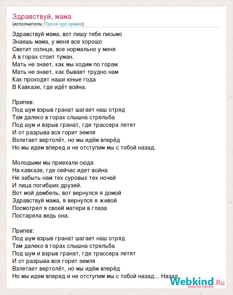 Здравствуй мама, вот пишу тебе письмо Знаешь мама, у меня все хорошо Светит солнце, все нормально у меня А в горах стоит туман. Мать не знает, как мы ходим по горам Мать не знает, как бывает трудно нам Как проходят наши юные года В Кавказе, где идёт война. Припев: Под шум взрыв гранат шагает наш отряд Там далеко в горах слышна стрельба Под шум и взрыв гранат, где трассера летят И от разрыва вся горит земля Взлетает вертолёт, но мы идём вперёд Но мы идем вперед и не отступим мы с тобой назад. Молодыми мы приехали сюда На кавказе, где сейчас идет война Не забыть нам тех суровых тех ночей И лица погибших друзей. Вот мой дембель, вот вернулся я домой Здравствуй мама, я вернулся я живой Посмотрел я своей матери в глаза Постарела ведь она. Припев: Под шум взрыв гранат шагает наш отряд Там далеко в горах слышна стрельба Под шум и взрыв гранат, где трассера летят И от разрыва вся горит земля Взлетает вертолёт, но мы идём вперёд Но мы идем вперед и не отступим мы с тобой назад... Назад
