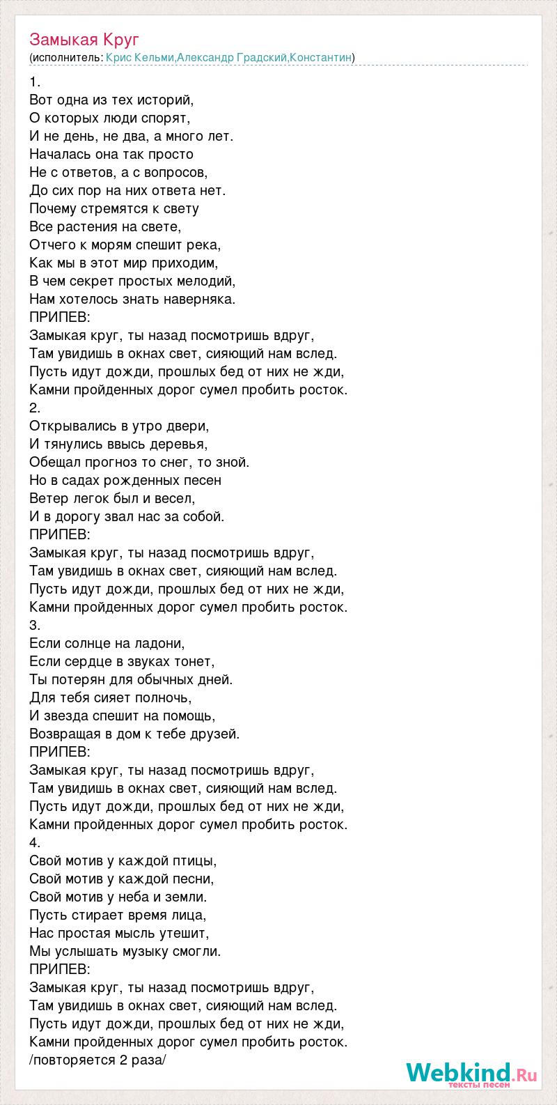1. Вот одна из тех историй, О которых люди спорят, И не день, не два, а много лет. Началась она так просто Не с ответов, а с вопросов, До сих пор на них ответа нет. Почему стремятся к свету Все растения на свете, Отчего к морям спешит река, Как мы в этот мир приходим, В чем секрет простых мелодий, Нам хотелось знать наверняка. ПРИПЕВ: Замыкая круг, ты назад посмотришь вдруг, Там увидишь в окнах свет, сияющий нам вслед. Пусть идут дожди, прошлых бед от них не жди, Камни пройденных дорог сумел пробить росток. 2. Открывались в утро двери, И тянулись ввысь деревья, Обещал прогноз то снег, то зной. Но в садах рожденных песен Ветер легок был и весел, И в дорогу звал нас за собой. ПРИПЕВ: Замыкая круг, ты назад посмотришь вдруг, Там увидишь в окнах свет, сияющий нам вслед. Пусть идут дожди, прошлых бед от них не жди, Камни пройденных дорог сумел пробить росток. 3. Если солнце на ладони, Если сердце в звуках тонет, Ты потерян для обычных дней. Для тебя сияет полночь, И звезда спешит на помощь, Возвращая в дом к тебе друзей. ПРИПЕВ: Замыкая круг, ты назад посмотришь вдруг, Там увидишь в окнах свет, сияющий нам вслед. Пусть идут дожди, прошлых бед от них не жди, Камни пройденных дорог сумел пробить росток. 4. Свой мотив у каждой птицы, Свой мотив у каждой песни, Свой мотив у неба и земли. Пусть стирает время лица, Нас простая мысль утешит, Мы услышать музыку смогли. ПРИПЕВ: Замыкая круг, ты назад посмотришь вдруг, Там увидишь в окнах свет, сияющий нам вслед. Пусть идут дожди, прошлых бед от них не жди, Камни пройденных дорог сумел пробить росток. /повторяется 2 раза/