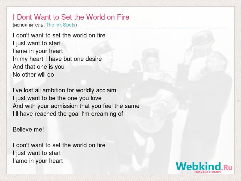 I don't want to set the world on fire I just want to start flame in your heart In my heart I have but one desire And that one is you No other will do I've lost all ambition for worldly acclaim I just want to be the one you love And with your admission that you feel the same I'll have reached the goal I'm dreaming of Believe me! I don't want to set the world on fire I just want to start flame in your heart