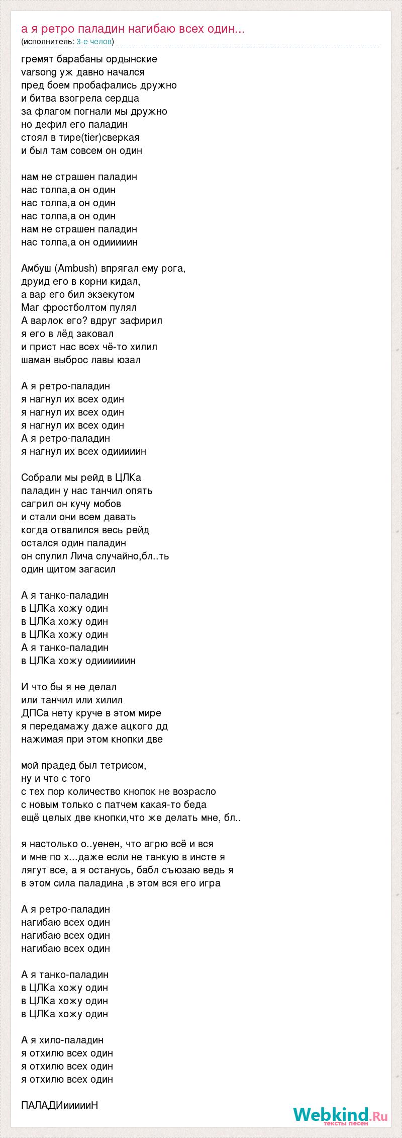 гремят барабаны ордынские varsong уж давно начался пред боем пробафались дружно и битва взогрела сердца за флагом погнали мы дружно но дефил его паладин стоял в тире(tier)сверкая и был там совсем он один нам не страшен паладин нас толпа,а он один нас толпа,а он один нас толпа,а он один нам не страшен паладин нас толпа,а он одииииин Амбуш (Ambush) впрягал ему рога, друид его в корни кидал, а вар его бил экзекутом Маг фростболтом пулял А варлок его? вдруг зафирил я его в лёд заковал и прист нас всех чё-то хилил шаман выброс лавы юзал А я ретро-паладин я нагнул их всех один я нагнул их всех один я нагнул их всех один А я ретро-паладин я нагнул их всех одииииин Собрали мы рейд в ЦЛКа паладин у нас танчил опять сагрил он кучу мобов и стали они всем давать когда отвалился весь рейд остался один паладин он спулил Лича случайно,бл..ть один щитом загасил А я танко-паладин в ЦЛКа хожу один в ЦЛКа хожу один в ЦЛКа хожу один А я танко-паладин в ЦЛКа хожу одиииииин И что бы я не делал или танчил или хилил ДПСа нету круче в этом мире я передамажу даже ацкого дд нажимая при этом кнопки две мой прадед был тетрисом, ну и что с того с тех пор количество кнопок не возрасло с новым только с патчем какая-то беда ещё целых две кнопки,что же делать мне, бл.. я настолько о..уенен, что агрю всё и вся и мне по х...даже если не танкую в инсте я лягут все, а я останусь, бабл съюзаю ведь я в этом сила паладина ,в этом вся его игра А я ретро-паладин нагибаю всех один нагибаю всех один нагибаю всех один А я танко-паладин в ЦЛКа хожу один в ЦЛКа хожу один в ЦЛКа хожу один А я хило-паладин я отхилю всех один я отхилю всех один я отхилю всех один ПАЛАДИиииииН