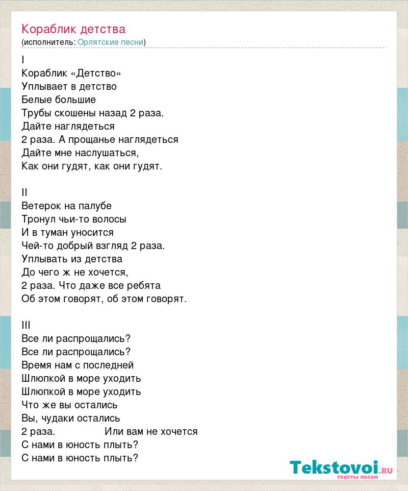 I Кораблик «Детство» Уплывает в детство Белые большие Трубы скошены назад 2 раза. Дайте наглядеться 2 раза. А прощанье наглядеться Дайте мне наслушаться, Как они гудят, как они гудят. II Ветерок на палубе Тронул чьи-то волосы И в туман уносится Чей-то добрый взгляд 2 раза. Уплывать из детства До чего ж не хочется, 2 раза. Что даже все ребята Об этом говорят, об этом говорят. III Все ли распрощались? Все ли распрощались? Время нам с последней Шлюпкой в море уходить Шлюпкой в море уходить Что же вы остались Вы, чудаки остались 2 раза. Или вам не хочется С нами в юность плыть? С нами в юность плыть?
