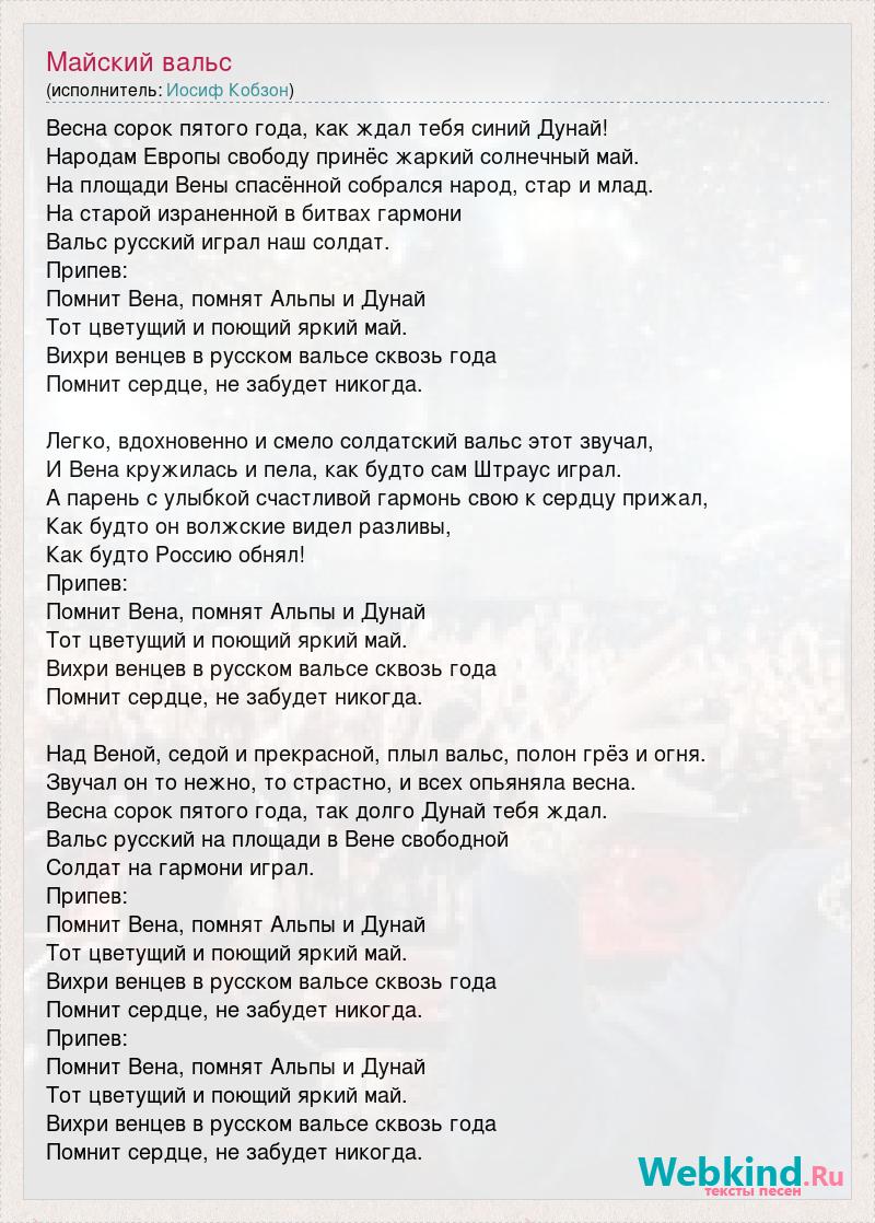 Весна сорок пятого года, как ждал тебя синий Дунай! Народам Европы свободу принёс жаркий солнечный май. На площади Вены спасённой собрался народ, стар и млад. На старой израненной в битвах гармони Вальс русский играл наш солдат. Припев: Помнит Вена, помнят Альпы и Дунай Тот цветущий и поющий яркий май. Вихри венцев в русском вальсе сквозь года Помнит сердце, не забудет никогда. Легко, вдохновенно и смело солдатский вальс этот звучал, И Вена кружилась и пела, как будто сам Штраус играл. А парень с улыбкой счастливой гармонь свою к сердцу прижал, Как будто он волжские видел разливы, Как будто Россию обнял! Припев: Помнит Вена, помнят Альпы и Дунай Тот цветущий и поющий яркий май. Вихри венцев в русском вальсе сквозь года Помнит сердце, не забудет никогда. Над Веной, седой и прекрасной, плыл вальс, полон грёз и огня. Звучал он то нежно, то страстно, и всех опьяняла весна. Весна сорок пятого года, так долго Дунай тебя ждал. Вальс русский на площади в Вене свободной Солдат на гармони играл. Припев: Помнит Вена, помнят Альпы и Дунай Тот цветущий и поющий яркий май. Вихри венцев в русском вальсе сквозь года Помнит сердце, не забудет никогда. Припев: Помнит Вена, помнят Альпы и Дунай Тот цветущий и поющий яркий май. Вихри венцев в русском вальсе сквозь года Помнит сердце, не забудет никогда.