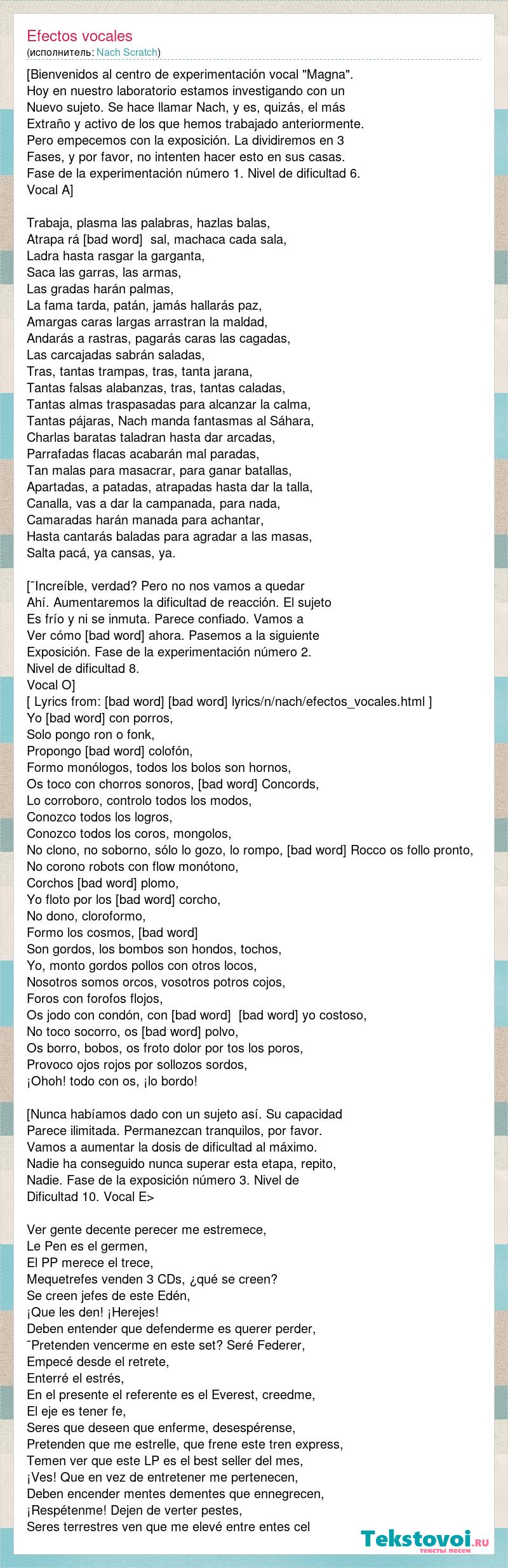 [Bienvenidos al centro de experimentación vocal "Magna". Hoy en nuestro laboratorio estamos investigando con un Nuevo sujeto. Se hace llamar Nach, y es, quizás, el más Extraño y activo de los que hemos trabajado anteriormente. Pero empecemos con la exposición. La dividiremos en 3 Fases, y por favor, no intenten hacer esto en sus casas. Fase de la experimentación número 1. Nivel de dificultad 6. Vocal A] Trabaja, plasma las palabras, hazlas balas, Atrapa rá [bad word] sal, machaca cada sala, Ladra hasta rasgar la garganta, Saca las garras, las armas, Las gradas harán palmas, La fama tarda, patán, jamás hallarás paz, Amargas caras largas arrastran la maldad, Andarás a rastras, pagarás caras las cagadas, Las carcajadas sabrán saladas, Tras, tantas trampas, tras, tanta jarana, Tantas falsas alabanzas, tras, tantas caladas, Tantas almas traspasadas para alcanzar la calma, Tantas pájaras, Nach manda fantasmas al Sáhara, Charlas baratas taladran hasta dar arcadas, Parrafadas flacas acabarán mal paradas, Tan malas para masacrar, para ganar batallas, Apartadas, a patadas, atrapadas hasta dar la talla, Canalla, vas a dar la campanada, para nada, Camaradas harán manada para achantar, Hasta cantarás baladas para agradar a las masas, Salta pacá, ya cansas, ya. [¯Increíble, verdad? Pero no nos vamos a quedar Ahí. Aumentaremos la dificultad de reacción. El sujeto Es frío y ni se inmuta. Parece confiado. Vamos a Ver cómo [bad word] ahora. Pasemos a la siguiente Exposición. Fase de la experimentación número 2. Nivel de dificultad 8. Vocal O] [ Lyrics from: [bad word] [bad word] lyrics/n/nach/efectos_vocales.html ] Yo [bad word] con porros, Solo pongo ron o fonk, Propongo [bad word] colofón, Formo monólogos, todos los bolos son hornos, Os toco con chorros sonoros, [bad word] Concords, Lo corroboro, controlo todos los modos, Conozco todos los logros, Conozco todos los coros, mongolos, No clono, no soborno, sólo lo gozo, lo rompo, [bad word] Rocco os follo pronto, No corono robots con flow monótono, Corchos [bad word] plomo, Yo floto por los [bad word] corcho, No dono, cloroformo, Formo los cosmos, [bad word] Son gordos, los bombos son hondos, tochos, Yo, monto gordos pollos con otros locos, Nosotros somos orcos, vosotros potros cojos, Foros con forofos flojos, Os jodo con condón, con [bad word] [bad word] yo costoso, No toco socorro, os [bad word] polvo, Os borro, bobos, os froto dolor por tos los poros, Provoco ojos rojos por sollozos sordos, ¡Ohoh! todo con os, ¡lo bordo! [Nunca habíamos dado con un sujeto así. Su capacidad Parece ilimitada. Permanezcan tranquilos, por favor. Vamos a aumentar la dosis de dificultad al máximo. Nadie ha conseguido nunca superar esta etapa, repito, Nadie. Fase de la exposición número 3. Nivel de Dificultad 10. Vocal E> Ver gente decente perecer me estremece, Le Pen es el germen, El PP merece el trece, Mequetrefes venden 3 CDs, ¿qué se creen? Se creen jefes de este Edén, ¡Que les den! ¡Herejes! Deben entender que defenderme es querer perder, ¯Pretenden vencerme en este set? Seré Federer, Empecé desde el retrete, Enterré el estrés, En el presente el referente es el Everest, creedme, El eje es tener fe, Seres que deseen que enferme, desespérense, Pretenden que me estrelle, que frene este tren express, Temen ver que este LP es el best seller del mes, ¡Ves! Que en vez de entretener me pertenecen, Deben encender mentes dementes que ennegrecen, ¡Respétenme! Dejen de verter pestes, Seres terrestres ven que me elevé entre entes cel