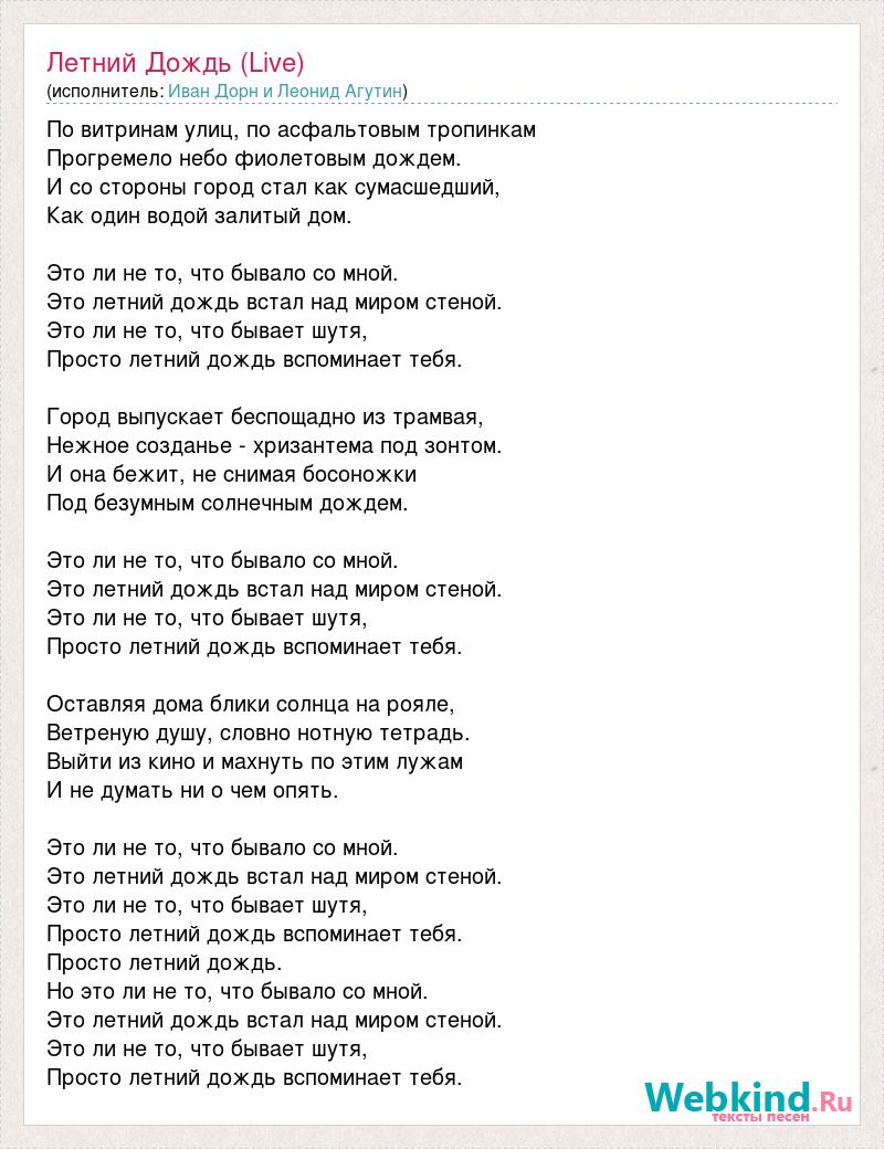 По витринам улиц, по асфальтовым тропинкам Прогремело небо фиолетовым дождем. И со стороны город стал как сумасшедший, Как один водой залитый дом. Это ли не то, что бывало со мной. Это летний дождь встал над миром стеной. Это ли не то, что бывает шутя, Просто летний дождь вспоминает тебя. Город выпускает беспощадно из трамвая, Нежное созданье - хризантема под зонтом. И она бежит, не снимая босоножки Под безумным солнечным дождем. Это ли не то, что бывало со мной. Это летний дождь встал над миром стеной. Это ли не то, что бывает шутя, Просто летний дождь вспоминает тебя. Оставляя дома блики солнца на рояле, Ветреную душу, словно нотную тетрадь. Выйти из кино и махнуть по этим лужам И не думать ни о чем опять. Это ли не то, что бывало со мной. Это летний дождь встал над миром стеной. Это ли не то, что бывает шутя, Просто летний дождь вспоминает тебя. Просто летний дождь. Но это ли не то, что бывало со мной. Это летний дождь встал над миром стеной. Это ли не то, что бывает шутя, Просто летний дождь вспоминает тебя.