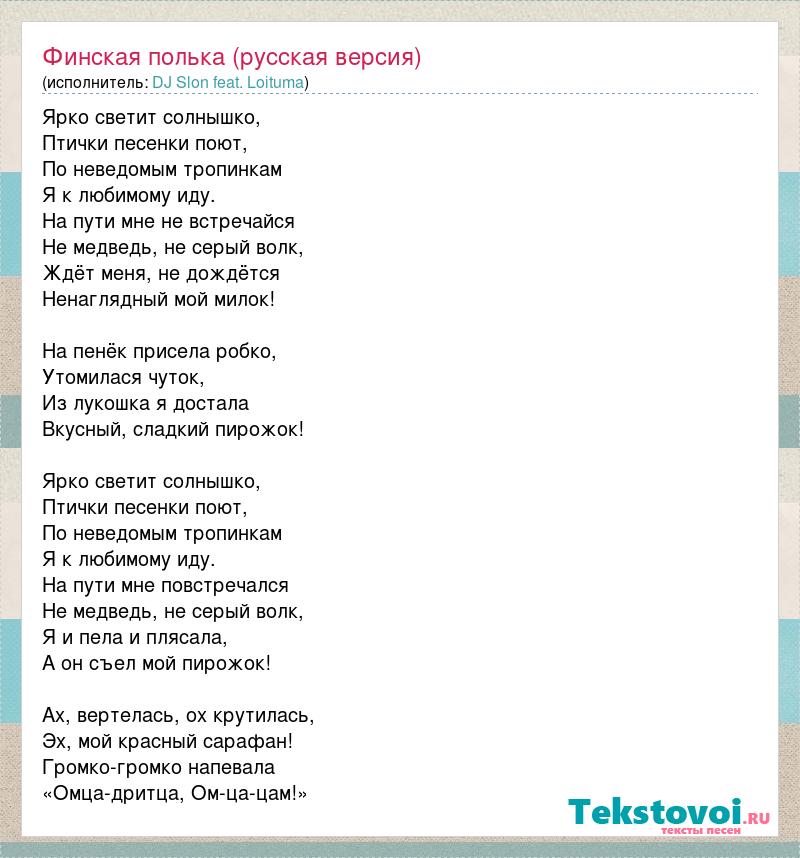 Ярко светит солнышко, Птички песенки поют, По неведомым тропинкам Я к любимому иду. На пути мне не встречайся Не медведь, не серый волк, Ждёт меня, не дождётся Ненаглядный мой милок! На пенёк присела робко, Утомилася чуток, Из лукошка я достала Вкусный, сладкий пирожок! Ярко светит солнышко, Птички песенки поют, По неведомым тропинкам Я к любимому иду. На пути мне повстречался Не медведь, не серый волк, Я и пела и плясала, А он съел мой пирожок! Ах, вертелась, ох крутилась, Эх, мой красный сарафан! Громко-громко напевала «Омца-дритца, Ом-ца-цам!»