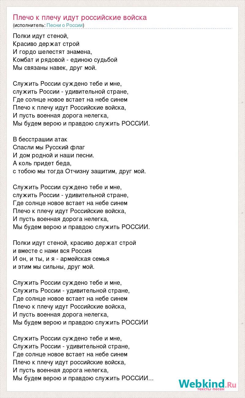 Полки идут стеной, Красиво держат строй И гордо шелестят знамена, Комбат и рядовой - единою судьбой Мы связаны навек, друг мой. Служить России суждено тебе и мне, служить России - удивительной стране, Где солнце новое встает на небе синем Плечо к плечу идут Российские войска, И пусть военная дорога нелегка, Мы будем верою и правдою служить РОССИИ. В бесстрашии атак Спасли мы Русский флаг И дом родной и наши песни. А коль придет беда, с тобою мы тогда Отчизну защитим, друг мой. Служить России суждено тебе и мне, служить России - удивительной стране, Где солнце новое встает на небе синем Плечо к плечу идут Российские войска, И пусть военная дорога нелегка, Мы будем верою и правдою служить РОССИИ. Полки идут стеной, красиво держат строй и вместе с нами вся Россия И он, и ты, и я - армейская семья и этим мы сильны, друг мой. Служить России суждено тебе и мне, Служить России - удивительной стране, Где солнце новое встает на небе синем Плечо к плечу идут Российские войска, И пусть военная дорога нелегка, Мы будем верою и правдою служить РОССИИ Служить России суждено тебе и мне, Служить России - удивительной стране, Где солнце новое встает на небе синем Плечо к плечу идут российские войска, И пусть военная дорога нелегка, Мы будем верою и правдою служить РОССИИ...