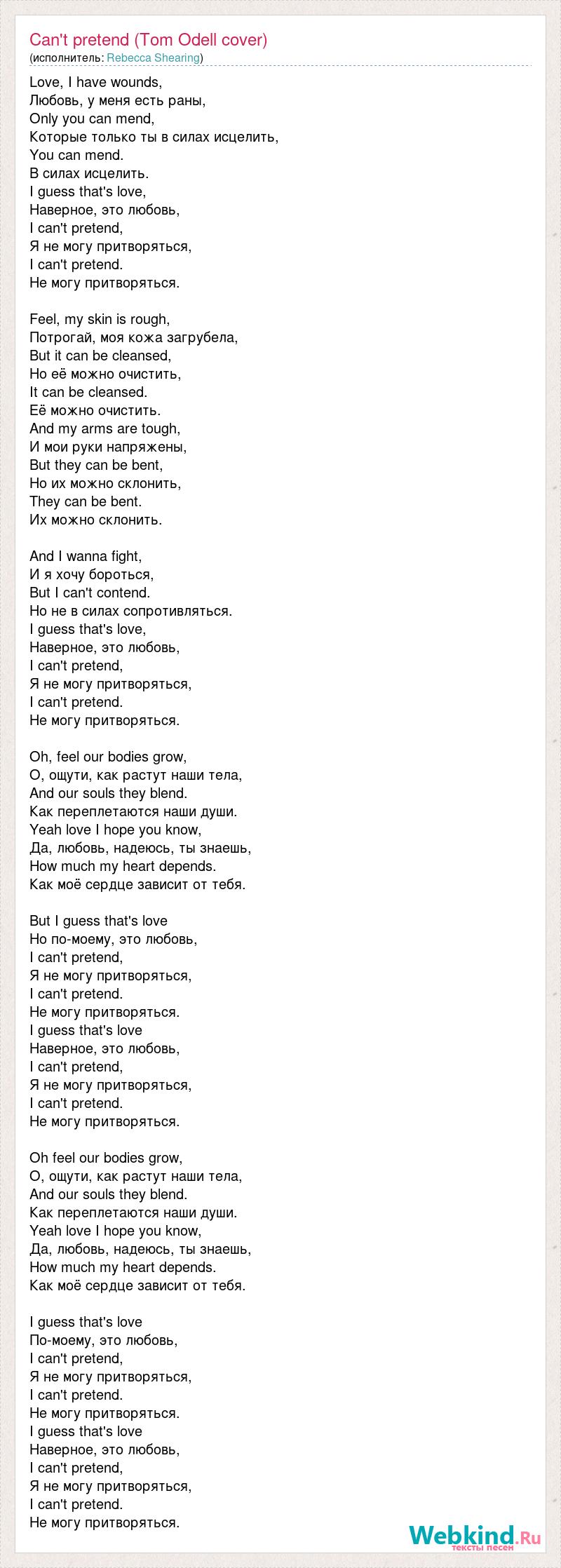 Love, I have wounds, Любовь, у меня есть раны, Only you can mend, Которые только ты в силах исцелить, You can mend. В силах исцелить. I guess that's love, Наверное, это любовь, I can't pretend, Я не могу притворяться, I can't pretend. Не могу притворяться. Feel, my skin is rough, Потрогай, моя кожа загрубела, But it can be cleansed, Но её можно очистить, It can be cleansed. Её можно очистить. And my arms are tough, И мои руки напряжены, But they can be bent, Но их можно склонить, They can be bent. Их можно склонить. And I wanna fight, И я хочу бороться, But I can't contend. Но не в силах сопротивляться. I guess that's love, Наверное, это любовь, I can't pretend, Я не могу притворяться, I can't pretend. Не могу притворяться. Oh, feel our bodies grow, О, ощути, как растут наши тела, And our souls they blend. Как переплетаются наши души. Yeah love I hope you know, Да, любовь, надеюсь, ты знаешь, How much my heart depends. Как моё сердце зависит от тебя. But I guess that's love Но по-моему, это любовь, I can't pretend, Я не могу притворяться, I can't pretend. Не могу притворяться. I guess that's love Наверное, это любовь, I can't pretend, Я не могу притворяться, I can't pretend. Не могу притворяться. Oh feel our bodies grow, О, ощути, как растут наши тела, And our souls they blend. Как переплетаются наши души. Yeah love I hope you know, Да, любовь, надеюсь, ты знаешь, How much my heart depends. Как моё сердце зависит от тебя. I guess that's love По-моему, это любовь, I can't pretend, Я не могу притворяться, I can't pretend. Не могу притворяться. I guess that's love Наверное, это любовь, I can't pretend, Я не могу притворяться, I can't pretend. Не могу притворяться.