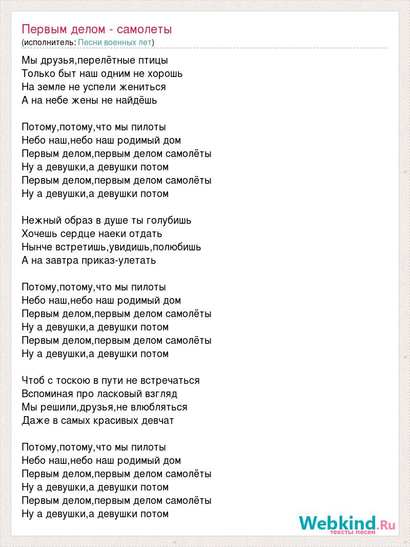 Мы друзья,перелётные птицы Только быт наш одним не хорошь На земле не успели жениться А на небе жены не найдёшь Потому,потому,что мы пилоты Небо наш,небо наш родимый дом Первым делом,первым делом самолёты Ну а девушки,а девушки потом Первым делом,первым делом самолёты Ну а девушки,а девушки потом Нежный образ в душе ты голубишь Хочешь сердце наеки отдать Нынче встретишь,увидишь,полюбишь А на завтра приказ-улетать Потому,потому,что мы пилоты Небо наш,небо наш родимый дом Первым делом,первым делом самолёты Ну а девушки,а девушки потом Первым делом,первым делом самолёты Ну а девушки,а девушки потом Чтоб с тоскою в пути не встречаться Вспоминая про ласковый взгляд Мы решили,друзья,не влюбляться Даже в самых красивых девчат Потому,потому,что мы пилоты Небо наш,небо наш родимый дом Первым делом,первым делом самолёты Ну а девушки,а девушки потом Первым делом,первым делом самолёты Ну а девушки,а девушки потом