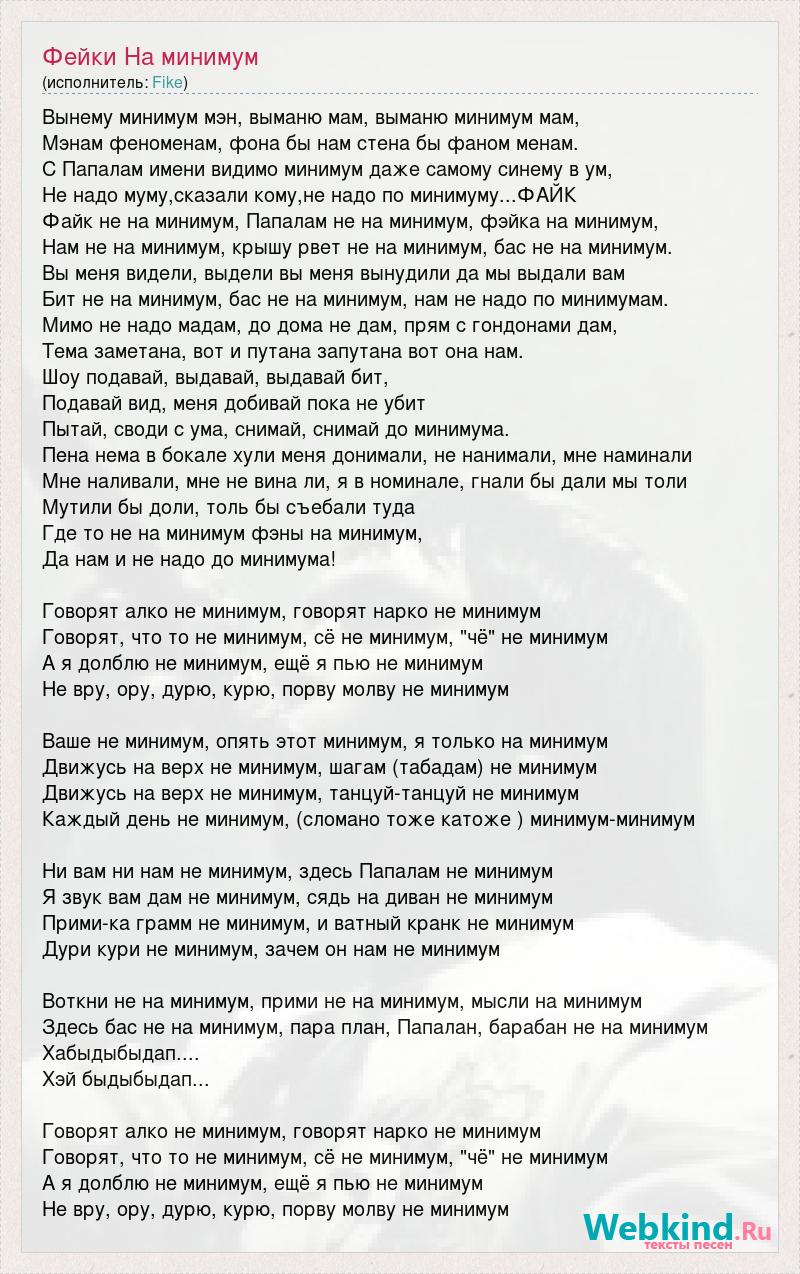 Вынему минимум мэн, выманю мам, выманю минимум мам, Мэнам феноменам, фона бы нам стена бы фаном менам. С Папалам имени видимо минимум даже самому синему в ум, Не надо муму,сказали кому,не надо по минимуму...ФАЙК Файк не на минимум, Папалам не на минимум, фэйка на минимум, Нам не на минимум, крышу рвет не на минимум, бас не на минимум. Вы меня видели, выдели вы меня вынудили да мы выдали вам Бит не на минимум, бас не на минимум, нам не надо по минимумам. Мимо не надо мадам, до дома не дам, прям с гондонами дам, Тема заметана, вот и путана запутана вот она нам. Шоу подавай, выдавай, выдавай бит, Подавай вид, меня добивай пока не убит Пытай, своди с ума, снимай, снимай до минимума. Пена нема в бокале хули меня донимали, не нанимали, мне наминали Мне наливали, мне не вина ли, я в номинале, гнали бы дали мы толи Мутили бы доли, толь бы съебали туда Где то не на минимум фэны на минимум, Да нам и не надо до минимума! Говорят алко не минимум, говорят нарко не минимум Говорят, что то не минимум, сё не минимум, "чё" не минимум А я долблю не минимум, ещё я пью не минимум Не вру, ору, дурю, курю, порву молву не минимум Ваше не минимум, опять этот минимум, я только на минимум Движусь на верх не минимум, шагам (табадам) не минимум Движусь на верх не минимум, танцуй-танцуй не минимум Каждый день не минимум, (сломано тоже катоже ) минимум-минимум Ни вам ни нам не минимум, здесь Папалам не минимум Я звук вам дам не минимум, сядь на диван не минимум Прими-ка грамм не минимум, и ватный кранк не минимум Дури кури не минимум, зачем он нам не минимум Воткни не на минимум, прими не на минимум, мысли на минимум Здесь бас не на минимум, пара план, Папалан, барабан не на минимум Хабыдыбыдап.... Хэй быдыбыдап... Говорят алко не минимум, говорят нарко не минимум Говорят, что то не минимум, сё не минимум, "чё" не минимум А я долблю не минимум, ещё я пью не минимум Не вру, ору, дурю, курю, порву молву не минимум