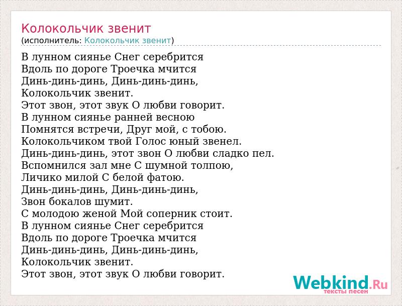 В лунном сиянье Снег серебрится Вдоль по дороге Троечка мчится Динь-динь-динь, Динь-динь-динь, Колокольчик звенит. Этот звон, этот звук О любви говорит. В лунном сиянье ранней весною Помнятся встречи, Друг мой, с тобою. Колокольчиком твой Голос юный звенел. Динь-динь-динь, этот звон О любви сладко пел. Вспомнился зал мне С шумной толпою, Личико милой С белой фатою. Динь-динь-динь, Динь-динь-динь, Звон бокалов шумит. С молодою женой Мой соперник стоит. В лунном сиянье Снег серебрится Вдоль по дороге Троечка мчится Динь-динь-динь, Динь-динь-динь, Колокольчик звенит. Этот звон, этот звук О любви говорит.