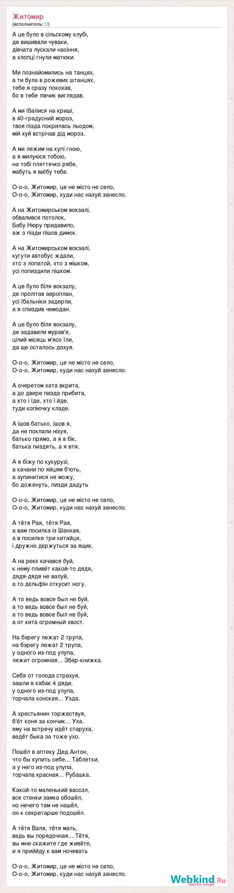 А це було в сільскому клубі, де вишивали чуваки, дівчата лускали насіння, а хлопці гнули матюки. Ми познайомились на танцях, а ти була в рожевих штанцях, тебе я сразу покохав, бо в тебе лівчик виглядав. А ми їбалися на криші, в 40-градусний мороз, твоя пізда покрилась льодом, мій хуй встрічав дід мороз. А ми лежим на купі гною, а я милуюся тобою, на тобі пляттячко рябе, мабуть я виїбу тебе. О-о-о, Житомир, це не місто не село, О-о-о, Житомир, куди нас нахуй занесло. А на Житомирськом вокзалі, обвалився потолок, Бабу Нюру придавило, аж з пізди пішов димок. А на Житомирськом вокзалі, кугути автобус ждали, хто з лопатой, хто з мішком, усі попиздили пішком. А це було біля вокзалу, де пролітав аероплан, усі їбальніки задерли, а я спиздив чемодан. А це було біля вокзалу, де задавили мурав'я, цілий місяць м'ясо їли, да ще осталось дохуя. О-о-о, Житомир, це не місто не село, О-о-о, Житомир, куди нас нахуй занесло. А очеретом хата вкрита, а до двере пизда прибита, а хто і їде, хто і йде, туди копіючку кладе. А ішов батько, ішов я, да не поклали ніхуя, батько прямо, а я в бік, батька пиздять, а я втік. А я біжу по кукурузі, а качани по яйцям б'ють, а зупинитися не можу, бо доженуть, пизди дадуть О-о-о, Житомир, це не місто не село, О-о-о, Житомир, куди нас нахуй занесло. А тётя Рая, тётя Рая, а вам посилка із Шанхая, а в посилке три китайця, і дружно дєржуться за ящик. А на рєкє качався буй, к нему пливёт какой-то дядя, дядя-дядя не валуй, а то дєльфін откусит ногу. А то ведь вовсе был не буй, а то ведь вовсе был не буй, а то ведь вовсе был не буй, а от кита огромный хвост. На бэрегу лежат 2 трупа, на бэрегу лежат 2 трупа, у одного из-под улупа, лежит огромная... Збер-книжка. Себя от голода страхуя, зашли в кабак 4 дяди, у одного из-под улупа, торчала конская... Узда. А хрестьянин торжествуя, б'ёт коня за кончик... Уха. ему на встречу идёт старуха, ведёт быка за тоже ухо. Пошёл в аптеку Дед Антон, что бы купить себе... Таблетки, а у него из-под улупа, торчала красная... Рубашка. Какой-то маленький вассал, все стенки замка обошёл, но нечего там не нашёл, он к секретарше подошёл. А тётя Валя, тётя мать, ведь вы порядочная... Тётя, вы мне скажите где живёте, и я приййду к вам ночевать О-о-о, Житомир, це не місто не село, О-о-о, Житомир, куди нас нахуй занесло.