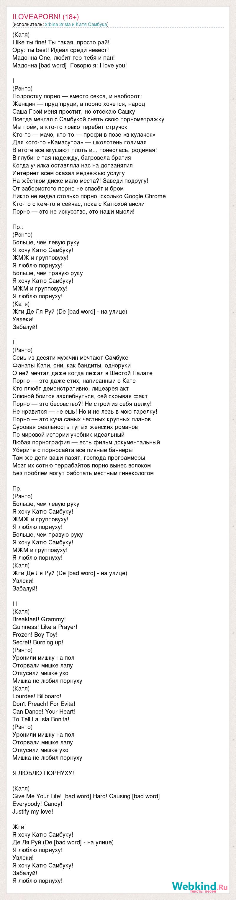 (Катя) I like ты fine! Ты такая, просто рай! Ору: ты best! Идеал среди невест! Мадонна One, любит гер тебя и пан! Мадонна [bad word] Говорю я: I love you! I (Рэнто) Подростку порно — вместо секса, и наоборот: Женщин — пруд пруди, а порно хочется, народ Саша Грэй меня простит, но отсекаю Сашку Всегда мечтал с Самбукой снять свою порнометражку Мы поём, а кто-то ловко теребит стручок Кто-то — мачо, кто-то — профи в позе «в кулачок» Для кого-то «Камасутра» — школотень голимая В итоге все вкушают плоть и... понеслась, родимая! В глубине тая надежду, багровела братия Когда училка оставляла нас на допзанятия Интернет всем оказал медвежью услугу На жёстком диске мало места?! Заведи подругу! От забористого порно не спасёт и бром Никто не видел столько порно, сколько Google Chrome Кто-то с кем-то и сейчас, пока с Катюхой висли Порно — это не искусство, это наши мысли! Пр.: (Рэнто) Больше, чем левую руку Я хочу Катю Самбуку! ЖМЖ и групповуху! Я люблю порнуху! Больше, чем правую руку Я хочу Катю Самбуку! МЖМ и групповуху! Я люблю порнуху! (Катя) Жги Де Ля Руй (De [bad word] - на улице) Увлеки! Забалуй! II (Рэнто) Семь из десяти мужчин мечтают Самбуке Фанаты Кати, они, как бандиты, одноруки О ней мечтал даже когда лежал в Шестой Палате Порно — это даже стих, написанный о Кате Кто плюёт демонстративно, лицезрея акт Слюной боится захлебнуться, сей скрывая факт Порно — это бесовство?! Не строй из себя целку! Не нравится — не ешь! Но и не лезь в мою тарелку! Порно — это куча самых честных крупных планов Суровая реальность тупых женских романов По мировой истории учебник идеальный Любая порнография — есть фильм документальный Уберите с порносайта все пивные баннеры Там же дети ваши лазят, господа программеры Мозг их сотню террабайтов порно вынес волоком Без проблем могут работать местным гинекологом Пр. (Рэнто) Больше, чем левую руку Я хочу Катю Самбуку! ЖМЖ и групповуху! Я люблю порнуху! Больше, чем правую руку Я хочу Катю Самбуку! МЖМ и групповуху! Я люблю порнуху! (Катя) Жги Де Ля Руй (De [bad word] - на улице) Увлеки! Забалуй! III (Катя) Breakfast! Grammy! Guinness! Like a Prayer! Frozen! Boy Toy! Secret! Burning up! (Рэнто) Уронили мишку на пол Оторвали мишке лапу Откусили мишке ухо Мишка не любил порнуху (Катя) Lourdes! Billboard! Don't Preach! For Evita! Can Dance! Your Heart! To Tell La Isla Bonita! (Рэнто) Уронили мишку на пол Оторвали мишке лапу Откусили мишке ухо Мишка не любил порнуху Я ЛЮБЛЮ ПОРНУХУ! (Катя) Give Me Your Life! [bad word] Hard! Causing [bad word] Everybody! Candy! Justify my love! Жги Я хочу Катю Самбуку! Де Ля Руй (De [bad word] - на улице) Я люблю порнуху! Увлеки! Я хочу Катю Самбуку! Забалуй! Я люблю порнуху!