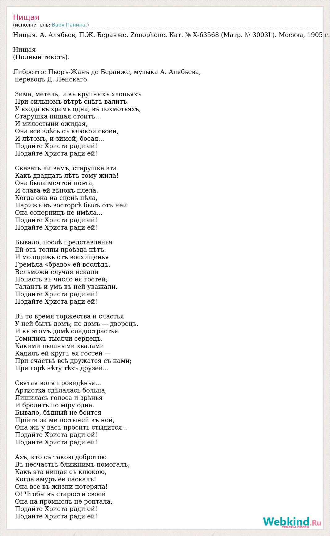 Нищая. А. Алябьев, П.Ж. Беранже. Zonophone. Кат. № X-63568 (Матр. № 3003L). Москва, 1905 г. Нищая (Полный текстъ). Либретто: Пьеръ-Жанъ де Беранже, музыка А. Алябьева, переводъ Д. Ленскаго. Зима, метель, и въ крупныхъ хлопьяхъ При сильномъ вѣтрѣ снѣгъ валитъ. У входа въ храмъ одна, въ лохмотьяхъ, Старушка нищая стоитъ... И милостыни ожидая, Она все здѣсь съ клюкой своей, И лѣтомъ, и зимой, босая... Подайте Христа ради ей! Подайте Христа ради ей! Сказать ли вамъ, старушка эта Какъ двадцать лѣтъ тому жила! Она была мечтой поэта, И слава ей вѣнокъ плела. Когда она на сценѣ пѣла, Парижъ въ восторгѣ былъ отъ ней. Она соперницъ не имѣла... Подайте Христа ради ей! Подайте Христа ради ей! Бывало, послѣ представленья Ей отъ толпы проѣзда нѣтъ. И молодежь отъ восхищенья Гремѣла «браво» ей вослѣдъ. Вельможи случая искали Попасть въ число ея гостей; Талантъ и умъ въ ней уважали. Подайте Христа ради ей! Подайте Христа ради ей! Въ то время торжества и счастья У ней былъ домъ; не домъ — дворецъ. И въ этомъ домѣ сладострастья Томились тысячи сердецъ. Какими пышными хвалами Кадилъ ей кругъ ея гостей — При счастьѣ всѣ дружатся съ нами; При горѣ нѣту тѣхъ друзей... Святая воля провидѣнья... Артистка сдѣлалась больна, Лишилась голоса и зрѣнья И бродитъ по міру одна. Бывало, бѣдный не боится Прійти за милостыней къ ней, Она жъ у васъ просить стыдится... Подайте Христа ради ей! Подайте Христа ради ей! Ахъ, кто съ такою добротою Въ несчастьѣ ближнимъ помогалъ, Какъ эта нищая съ клюкою, Когда амуръ ее ласкалъ! Она все въ жизни потеряла! О! Чтобы въ старости своей Она на промыслъ не роптала, Подайте Христа ради ей! Подайте Христа ради ей!