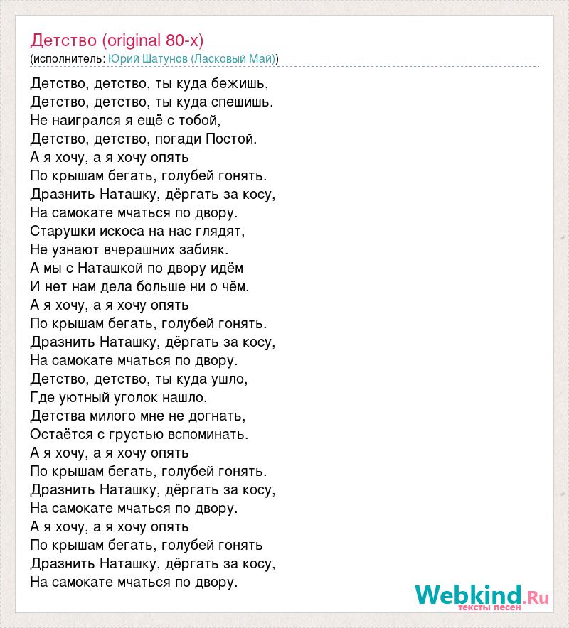 Детство, детство, ты куда бежишь, Детство, детство, ты куда спешишь. Не наигрался я ещё с тобой, Детство, детство, погади Постой. А я хочу, а я хочу опять По крышам бегать, голубей гонять. Дразнить Наташку, дёргать за косу, На самокате мчаться по двору. Старушки искоса на нас глядят, Не узнают вчерашних забияк. А мы с Наташкой по двору идём И нет нам дела больше ни о чём. А я хочу, а я хочу опять По крышам бегать, голубей гонять. Дразнить Наташку, дёргать за косу, На самокате мчаться по двору. Детство, детство, ты куда ушло, Где уютный уголок нашло. Детства милого мне не догнать, Остаётся с грустью вспоминать. А я хочу, а я хочу опять По крышам бегать, голубей гонять. Дразнить Наташку, дёргать за косу, На самокате мчаться по двору. А я хочу, а я хочу опять По крышам бегать, голубей гонять Дразнить Наташку, дёргать за косу, На самокате мчаться по двору.