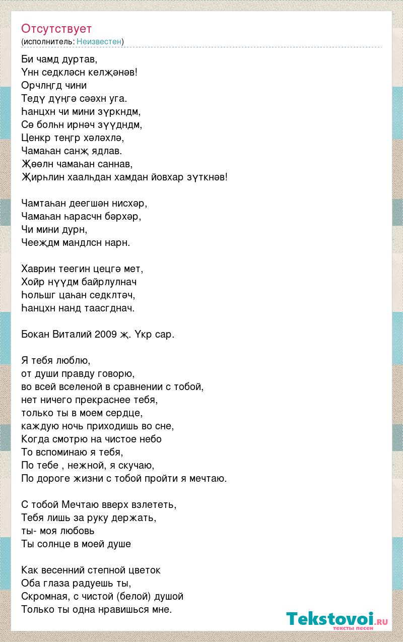 Би чамд дуртав, Үнн седкләсн келҗәнәв! Орчлңгд чини Тедү дүңгә сәәхн уга. Һанцхн чи мини зүркндм, Сө болһн ирнәч зүүдндм, Ценкр теңгр хәләхлә, Чамаһан санҗ ядлав. Җөөлн чамаһан саннав, Җирһлин хаалһдан хамдан йовхар зүткнәв! Чамтаһан деегшән нисхәр, Чамаһан һарасчн бәрхәр, Чи мини дурн, Чееҗдм мандлсн нарн. Хаврин теегин цецгә мет, Хойр нүүдм байрлулнач Һольшг цаһан седклтәч, Һанцхн нанд таасгднач. Бокан Виталий 2009 җ. Үкр сар. Я тебя люблю, от души правду говорю, во всей вселеной в сравнении с тобой, нет ничего прекраснее тебя, только ты в моем сердце, каждую ночь приходишь во сне, Когда смотрю на чистое небо То вспоминаю я тебя, По тебе , нежной, я скучаю, По дороге жизни с тобой пройти я мечтаю. С тобой Мечтаю вверх взлететь, Тебя лишь за руку держать, ты- моя любовь Ты солнце в моей душе Как весенний степной цветок Оба глаза радуешь ты, Скромная, с чистой (белой) душой Только ты одна нравишься мне.