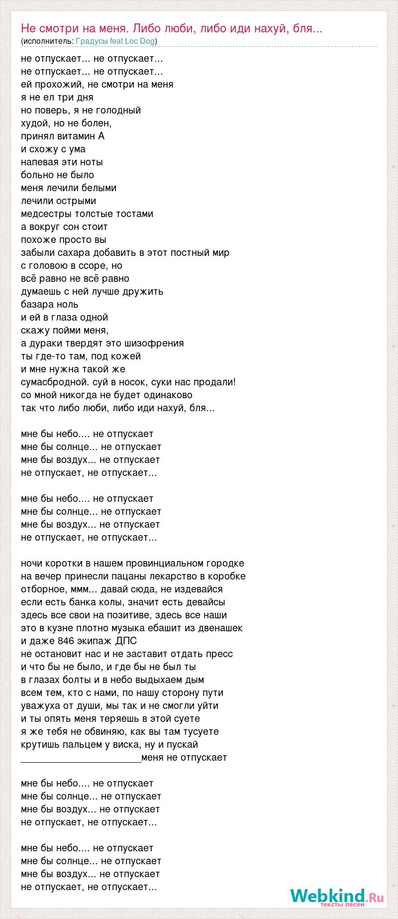 не отпускает... не отпускает... не отпускает... не отпускает... ей прохожий, не смотри на меня я не ел три дня но поверь, я не голодный худой, но не болен, принял витамин А и схожу с ума напевая эти ноты больно не было меня лечили белыми лечили острыми медсестры толстые тостами а вокруг сон стоит похоже просто вы забыли сахара добавить в этот постный мир с головою в ссоре, но всё равно не всё равно думаешь с ней лучше дружить базара ноль и ей в глаза одной скажу пойми меня, а дураки твердят это шизофрения ты где-то там, под кожей и мне нужна такой же сумасбродной. суй в носок, суки нас продали! со мной никогда не будет одинаково так что либо люби, либо иди нахуй, бля... мне бы небо.... не отпускает мне бы солнце... не отпускает мне бы воздух... не отпускает не отпускает, не отпускает... мне бы небо.... не отпускает мне бы солнце... не отпускает мне бы воздух... не отпускает не отпускает, не отпускает... ночи коротки в нашем провинциальном городке на вечер принесли пацаны лекарство в коробке отборное, ммм... давай сюда, не издевайся если есть банка колы, значит есть девайсы здесь все свои на позитиве, здесь все наши это в кузне плотно музыка ебашит из двенашек и даже 846 экипаж ДПС не остановит нас и не заставит отдать пресс и что бы не было, и где бы не был ты в глазах болты и в небо выдыхаем дым всем тем, кто с нами, по нашу сторону пути уважуха от души, мы так и не смогли уйти и ты опять меня теряешь в этой суете я же тебя не обвиняю, как вы там тусуете крутишь пальцем у виска, ну и пускай ______________________меня не отпускает мне бы небо.... не отпускает мне бы солнце... не отпускает мне бы воздух... не отпускает не отпускает, не отпускает... мне бы небо.... не отпускает мне бы солнце... не отпускает мне бы воздух... не отпускает не отпускает, не отпускает...