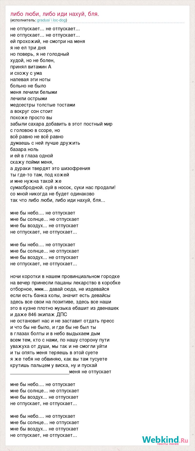не отпускает... не отпускает... не отпускает... не отпускает... ей прохожий, не смотри на меня я не ел три дня но поверь, я не голодный худой, но не болен, принял витамин А и схожу с ума напевая эти ноты больно не было меня лечили белыми лечили острыми медсестры толстые тостами а вокруг сон стоит похоже просто вы забыли сахара добавить в этот постный мир с головою в ссоре, но всё равно не всё равно думаешь с ней лучше дружить базара ноль и ей в глаза одной скажу пойми меня, а дураки твердят это шизофрения ты где-то там, под кожей и мне нужна такой же сумасбродной. суй в носок, суки нас продали! со мной никогда не будет одинаково так что либо люби, либо иди нахуй, бля... мне бы небо.... не отпускает мне бы солнце... не отпускает мне бы воздух... не отпускает не отпускает, не отпускает... мне бы небо.... не отпускает мне бы солнце... не отпускает мне бы воздух... не отпускает не отпускает, не отпускает... ночи коротки в нашем провинциальном городке на вечер принесли пацаны лекарство в коробке отборное, ммм... давай сюда, не издевайся если есть банка колы, значит есть девайсы здесь все свои на позитиве, здесь все наши это в кузне плотно музыка ебашит из двенашек и даже 846 экипаж ДПС не остановит нас и не заставит отдать пресс и что бы не было, и где бы не был ты в глазах болты и в небо выдыхаем дым всем тем, кто с нами, по нашу сторону пути уважуха от души, мы так и не смогли уйти и ты опять меня теряешь в этой суете я же тебя не обвиняю, как вы там тусуете крутишь пальцем у виска, ну и пускай ______________________меня не отпускает мне бы небо.... не отпускает мне бы солнце... не отпускает мне бы воздух... не отпускает не отпускает, не отпускает... мне бы небо.... не отпускает мне бы солнце... не отпускает мне бы воздух... не отпускает не отпускает, не отпускает...