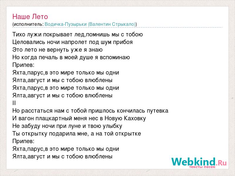 Тихо лужи покрывает лед,помнишь мы с тобою Целовались ночи напролет под шум прибоя Это лето не вернуть уже я знаю Но когда печаль в моей душе я вспоминаю Припев: Яхта,парус,в это мире только мы одни Ялта,август и мы с тобою влюблены Яхта,парус,в это мире только мы одни Ялта,август и мы с тобою влюблены II Но расстаться нам с тобой пришлось кончилась путевка И вагон плацкартный меня нес в Новую Каховку Не забуду ночи при луне и твою улыбку Ты открытку подарила мне, а на той открытке Припев: Яхта,парус,в это мире только мы одни Ялта,август и мы с тобою влюблены