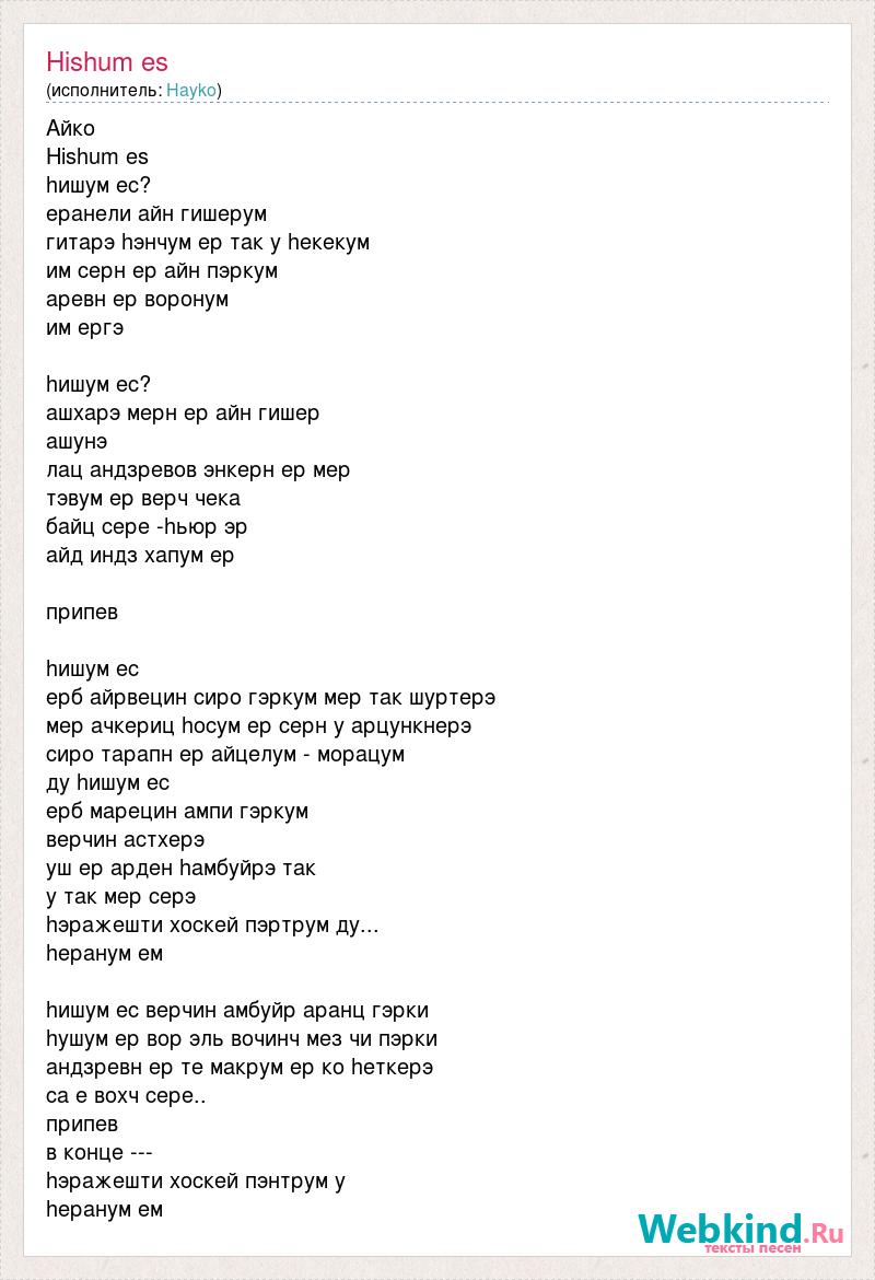 Айко Hishum es hишум ес? еранели айн гишерум гитарэ hэнчум ер так у hекекум им серн ер айн пэркум аревн ер воронум им ергэ hишум ес? ашхарэ мерн ер айн гишер ашунэ лац андзревов энкерн ер мер тэвум ер верч чека байц сере -hьюр эр айд индз хапум ер припев hишум ес ерб айрвецин сиро гэркум мер так шуртерэ мер ачкериц hосум ер серн у арцункнерэ сиро тарапн ер айцелум - морацум ду hишум ес ерб марецин ампи гэркум верчин астхерэ уш ер арден hамбуйрэ так у так мер серэ hэражешти хоскей пэртрум ду... hеранум ем hишум ес верчин амбуйр аранц гэрки hушум ер вор эль вочинч мез чи пэрки андзревн ер те макрум ер ко hеткерэ са е вохч сере.. припев в конце --- hэражешти хоскей пэнтрум у hеранум ем