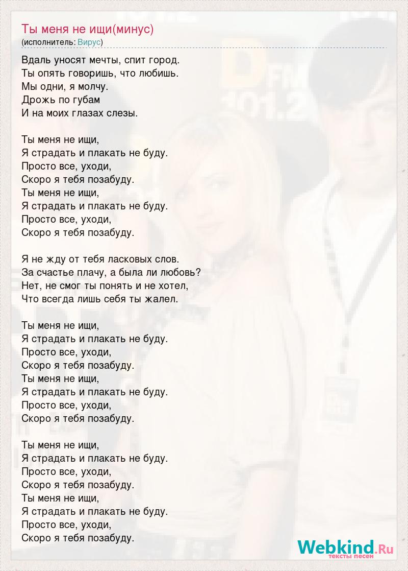 Вдаль уносят мечты, спит город. Ты опять говоришь, что любишь. Мы одни, я молчу. Дрожь по губам И на моих глазах слезы. Ты меня не ищи, Я страдать и плакать не буду. Просто все, уходи, Скоро я тебя позабуду. Ты меня не ищи, Я страдать и плакать не буду. Просто все, уходи, Скоро я тебя позабуду. Я не жду от тебя ласковых слов. За счастье плачу, а была ли любовь? Нет, не смог ты понять и не хотел, Что всегда лишь себя ты жалел. Ты меня не ищи, Я страдать и плакать не буду. Просто все, уходи, Скоро я тебя позабуду. Ты меня не ищи, Я страдать и плакать не буду. Просто все, уходи, Скоро я тебя позабуду. Ты меня не ищи, Я страдать и плакать не буду. Просто все, уходи, Скоро я тебя позабуду. Ты меня не ищи, Я страдать и плакать не буду. Просто все, уходи, Скоро я тебя позабуду.