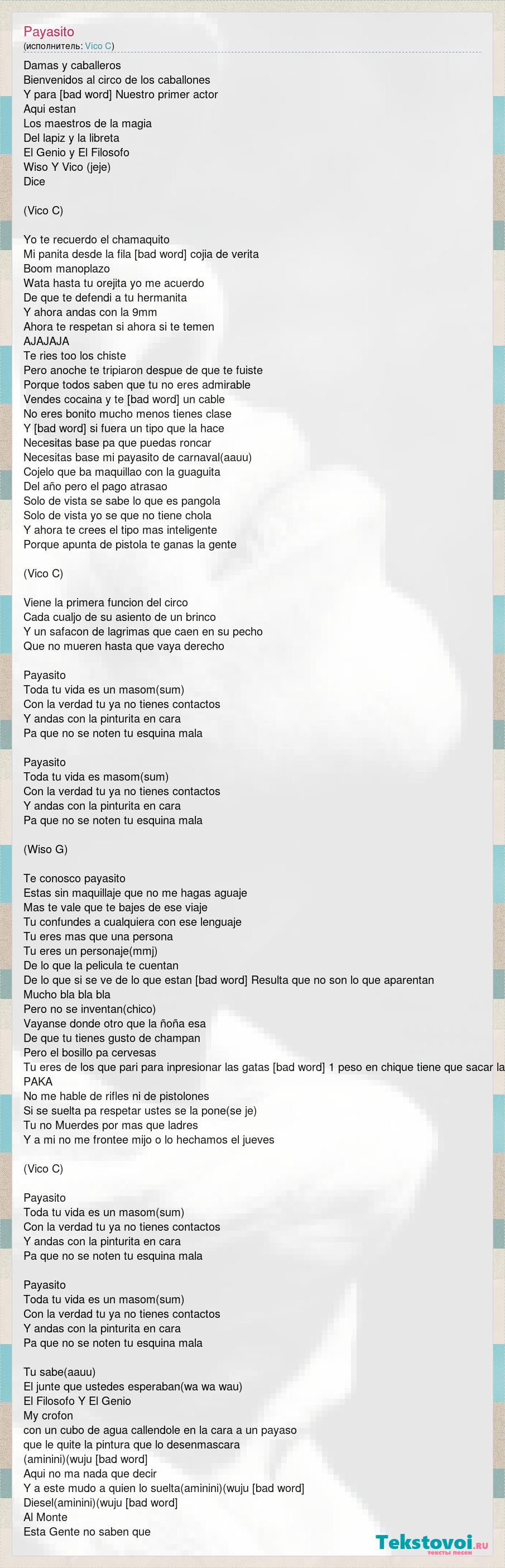 Damas y caballeros Bienvenidos al circo de los caballones Y para dar comienzo Nuestro primer actor Aqui estan Los maestros de la magia Del lapiz y la libreta El Genio y El Filosofo Wiso Y Vico (jeje) Dice (Vico C) Yo te recuerdo el chamaquito Mi panita desde la fila al comedor cojia de verita Boom manoplazo Wata hasta tu orejita yo me acuerdo De que te defendi a tu hermanita Y ahora andas con la 9mm Ahora te respetan si ahora si te temen AJAJAJA Te ries too los chiste Pero anoche te tripiaron despue de que te fuiste Porque todos saben que tu no eres admirable Vendes cocaina y te estas comiendo un cable No eres bonito mucho menos tienes clase Y camina como si fuera un tipo que la hace Necesitas base pa que puedas roncar Necesitas base mi payasito de carnaval(aauu) Cojelo que ba maquillao con la guaguita Del año pero el pago atrasao Solo de vista se sabe lo que es pangola Solo de vista yo se que no tiene chola Y ahora te crees el tipo mas inteligente Porque apunta de pistola te ganas la gente (Vico C) Viene la primera funcion del circo Cada cualjo de su asiento de un brinco Y un safacon de lagrimas que caen en su pecho Que no mueren hasta que vaya derecho Payasito Toda tu vida es un masom(sum) Con la verdad tu ya no tienes contactos Y andas con la pinturita en cara Pa que no se noten tu esquina mala Payasito Toda tu vida es masom(sum) Con la verdad tu ya no tienes contactos Y andas con la pinturita en cara Pa que no se noten tu esquina mala (Wiso G) Te conosco payasito Estas sin maquillaje que no me hagas aguaje Mas te vale que te bajes de ese viaje Tu confundes a cualquiera con ese lenguaje Tu eres mas que una persona Tu eres un personaje(mmj) De lo que la pelicula te cuentan De lo que si se ve de lo que estan hablando Comentan Resulta que no son lo que aparentan Mucho bla bla bla Pero no se inventan(chico) Vayanse donde otro que la ñoña esa De que tu tienes gusto de champan Pero el bosillo pa cervesas Tu eres de los que pari para inpresionar las gatas Pa comprar 1 peso en chique tiene que sacar la PAKA No me hable de rifles ni de pistolones Si se suelta pa respetar ustes se la pone(se je) Tu no Muerdes por mas que ladres Y a mi no me frontee mijo o lo hechamos el jueves (Vico C) Payasito Toda tu vida es un masom(sum) Con la verdad tu ya no tienes contactos Y andas con la pinturita en cara Pa que no se noten tu esquina mala Payasito Toda tu vida es un masom(sum) Con la verdad tu ya no tienes contactos Y andas con la pinturita en cara Pa que no se noten tu esquina mala Tu sabe(aauu) El junte que ustedes esperaban(wa wa wau) El Filosofo Y El Genio My crofon con un cubo de agua callendole en la cara a un payaso que le quite la pintura que lo desenmascara (aminini)(wuju jurujuru) Aqui no ma nada que decir Y a este mudo a quien lo suelta(aminini)(wuju jurujuru) Diesel(aminini)(wuju jurujuru) Al Monte Esta Gente no saben que