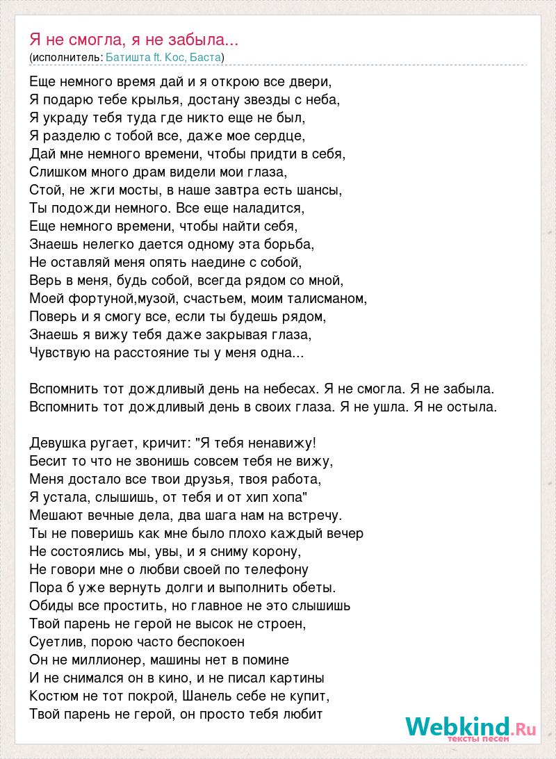 Еще немного время дай и я открою все двери, Я подарю тебе крылья, достану звезды с неба, Я украду тебя туда где никто еще не был, Я разделю с тобой все, даже мое сердце, Дай мне немного времени, чтобы придти в себя, Слишком много драм видели мои глаза, Стой, не жги мосты, в наше завтра есть шансы, Ты подожди немного. Все еще наладится, Еще немного времени, чтобы найти себя, Знаешь нелегко дается одному эта борьба, Не оставляй меня опять наедине с собой, Верь в меня, будь собой, всегда рядом со мной, Моей фортуной,музой, счастьем, моим талисманом, Поверь и я смогу все, если ты будешь рядом, Знаешь я вижу тебя даже закрывая глаза, Чувствую на расстояние ты у меня одна... Вспомнить тот дождливый день на небесах. Я не смогла. Я не забыла. Вспомнить тот дождливый день в своих глаза. Я не ушла. Я не остыла. Девушка ругает, кричит: "Я тебя ненавижу! Бесит то что не звонишь совсем тебя не вижу, Меня достало все твои друзья, твоя работа, Я устала, слышишь, от тебя и от хип хопа" Мешают вечные дела, два шага нам на встречу. Ты не поверишь как мне было плохо каждый вечер Не состоялись мы, увы, и я сниму корону, Не говори мне о любви своей по телефону Пора б уже вернуть долги и выполнить обеты. Обиды все простить, но главное не это слышишь Твой парень не герой не высок не строен, Суетлив, порою часто беспокоен Он не миллионер, машины нет в помине И не снимался он в кино, и не писал картины Костюм не тот покрой, Шанель себе не купит, Твой парень не герой, он просто тебя любит