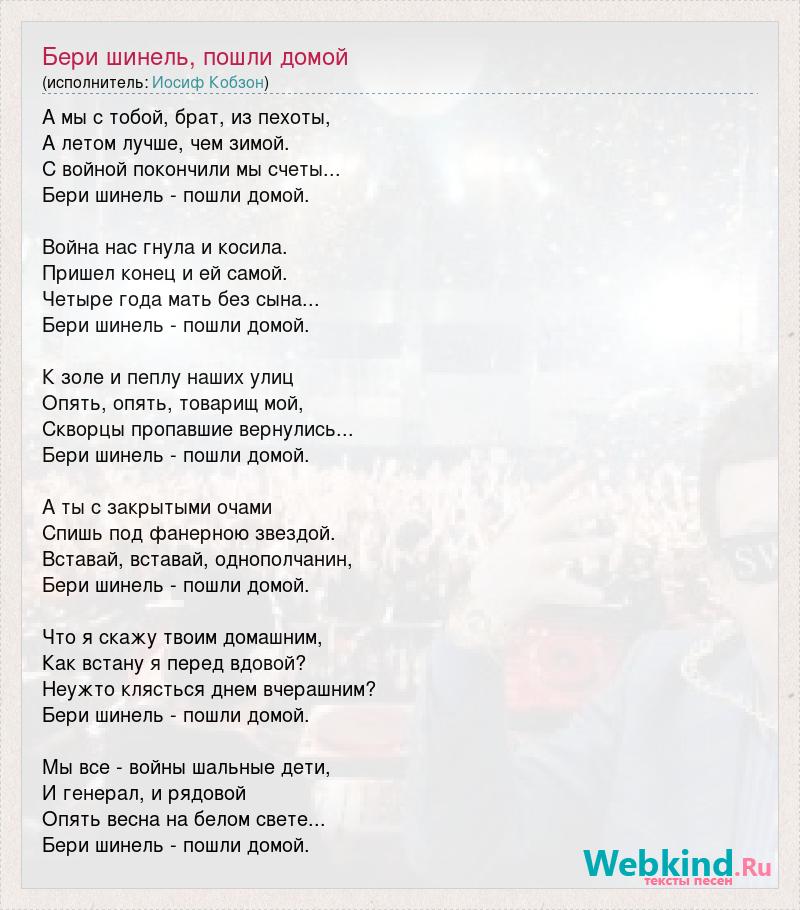 А мы с тобой, брат, из пехоты, А летом лучше, чем зимой. С войной покончили мы счеты... Бери шинель - пошли домой. Война нас гнула и косила. Пришел конец и ей самой. Четыре года мать без сына... Бери шинель - пошли домой. К золе и пеплу наших улиц Опять, опять, товарищ мой, Скворцы пропавшие вернулись... Бери шинель - пошли домой. А ты с закрытыми очами Спишь под фанерною звездой. Вставай, вставай, однополчанин, Бери шинель - пошли домой. Что я скажу твоим домашним, Как встану я перед вдовой? Неужто клясться днем вчерашним? Бери шинель - пошли домой. Мы все - войны шальные дети, И генерал, и рядовой Опять весна на белом свете... Бери шинель - пошли домой.