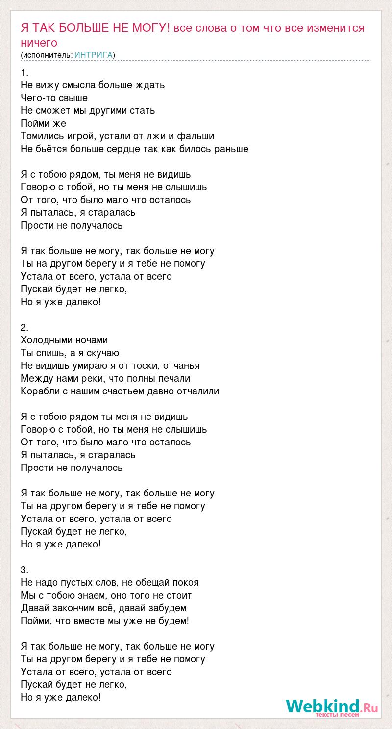 1. Не вижу смысла больше ждать Чего-то свыше Не сможет мы другими стать Пойми же Томились игрой, устали от лжи и фальши Не бьётся больше сердце так как билось раньше Я с тобою рядом, ты меня не видишь Говорю с тобой, но ты меня не слышишь От того, что было мало что осталось Я пыталась, я старалась Прости не получалось Я так больше не могу, так больше не могу Ты на другом берегу и я тебе не помогу Устала от всего, устала от всего Пускай будет не легко, Но я уже далеко! 2. Холодными ночами Ты спишь, а я скучаю Не видишь умираю я от тоски, отчанья Между нами реки, что полны печали Корабли с нашим счастьем давно отчалили Я с тобою рядом ты меня не видишь Говорю с тобой, но ты меня не слышишь От того, что было мало что осталось Я пыталась, я старалась Прости не получалось Я так больше не могу, так больше не могу Ты на другом берегу и я тебе не помогу Устала от всего, устала от всего Пускай будет не легко, Но я уже далеко! 3. Не надо пустых слов, не обещай покоя Мы с тобою знаем, оно того не стоит Давай закончим всё, давай забудем Пойми, что вместе мы уже не будем! Я так больше не могу, так больше не могу Ты на другом берегу и я тебе не помогу Устала от всего, устала от всего Пускай будет не легко, Но я уже далеко!
