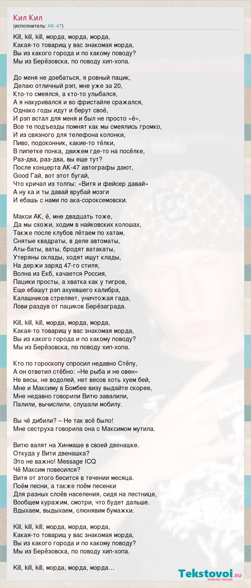 Kill, kill, kill, морда, морда, морда, Какая-то товарищ у вас знакомая морда, Вы из какого города и по какому поводу? Мы из Берёзовска, по поводу хип-хопа. До меня не доебаться, я ровный пацик, Делаю отличный рэп, мне уже за 20, Кто-то смеялся, а кто-то улыбался, А я накуривался и во фристайле сражался, Однако годы идут и берут своё, И рэп встал для меня и был не просто «ё», Все те подъезды помнят как мы смеялись громко, И из связного для телефона колонки, Пиво, подоконник, какие-то тёлки, В пипетке понка, движем где-то на посёлке, Раз-два, раз-два, вы еще тут? После концерта АК-47 автографы дают, Good Гай, вот этот бугай, Что кричал из толпы: «Витя и фейсер давай» А ну ка и ты давай врубай мозги И ебашь с нами по ака-сороксемовски. Макси АК, ё, мне двадцать тоже, Да мы схожи, ходим в найковских колошах, Также после клубов лётаем по хатам, Снятые квадраты, в деле автоматы, Аты-баты, ваты, бродят ватакаты, Утеряны оклады, ходят ищут клады, На держи заряд 47-го стиля, Волна из Екб, качается Россия, Пацики просты, а хватка как у тигров, Еще ебашут рэп ахуевшего калибра, Калашников стреляет, уничтожая гада, Лови раздув от пациков Берёзаграда. Kill, kill, kill, морда, морда, морда, Какая-то товарищ у вас знакомая морда, Вы из какого города и по какому поводу? Мы из Берёзовска, по поводу хип-хопа. Кто по гороскопу спросил недавно Стёпу, А он ответил стёбно: «Не рыба и не овен» Не весы, не водолей, нет весов хоть хуем бей, Мне и Максиму в Бомбее визу выдайте скорее, Мне недавно говорили Витю завалили, Палили, вычислили, слушали мобилу. Вы чё дибили? – Не так всё было! Мне сеструха говорила она с Максимом мутила. Витю валят на Хинмаше в своей двенашке. Откуда у Вити двенашка? Это не важно! Message ICQ Чё Максим повесился? Витя от этого бесится в течении месяца. Поём песни, а также поём песенки Для разных слоёв населения, сидя на лестнице, Вообщем куражим, смотри, что будет дальше. Вдыхаем, выдыхаем, слюнявим бумажки. Kill, kill, kill, морда, морда, морда, Какая-то товарищ у вас знакомая морда, Вы из какого города и по какому поводу? Мы из Берёзовска, по поводу хип-хопа. Kill, kill, kill, морда, морда, морда…