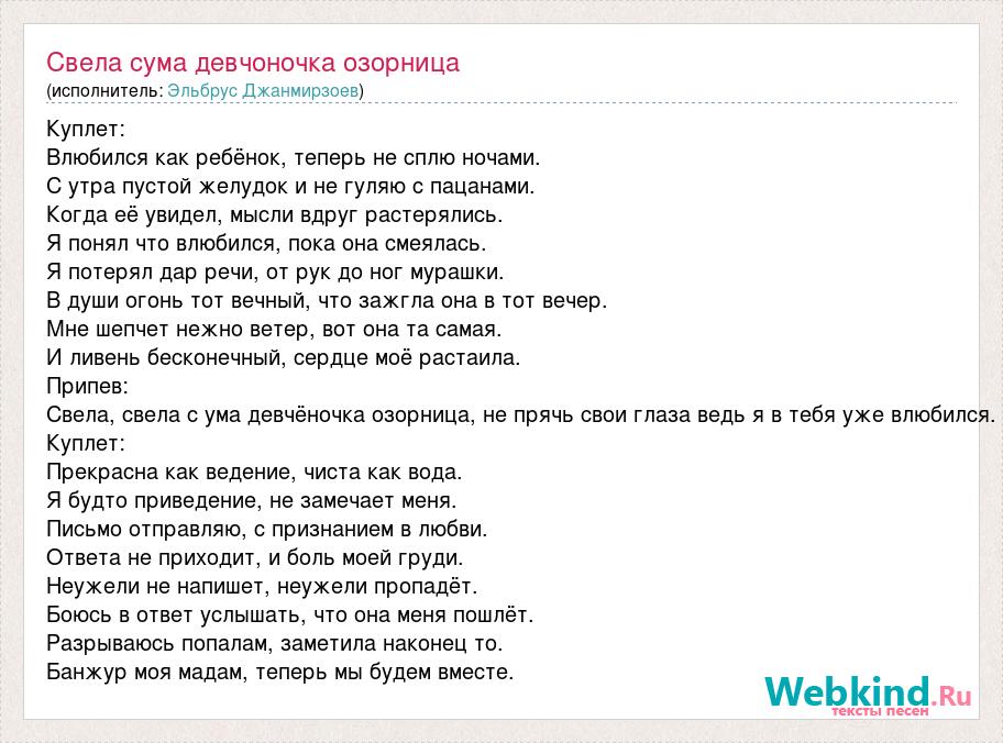 Куплет: Влюбился как ребёнок, теперь не сплю ночами. С утра пустой желудок и не гуляю с пацанами. Когда её увидел, мысли вдруг растерялись. Я понял что влюбился, пока она смеялась. Я потерял дар речи, от рук до ног мурашки. В души огонь тот вечный, что зажгла она в тот вечер. Мне шепчет нежно ветер, вот она та самая. И ливень бесконечный, сердце моё растаила. Припев: Свела, свела с ума девчёночка озорница, не прячь свои глаза ведь я в тебя уже влюбился. Куплет: Прекрасна как ведение, чиста как вода. Я будто приведение, не замечает меня. Письмо отправляю, с признанием в любви. Ответа не приходит, и боль моей груди. Неужели не напишет, неужели пропадёт. Боюсь в ответ услышать, что она меня пошлёт. Разрываюсь попалам, заметила наконец то. Банжур моя мадам, теперь мы будем вместе.