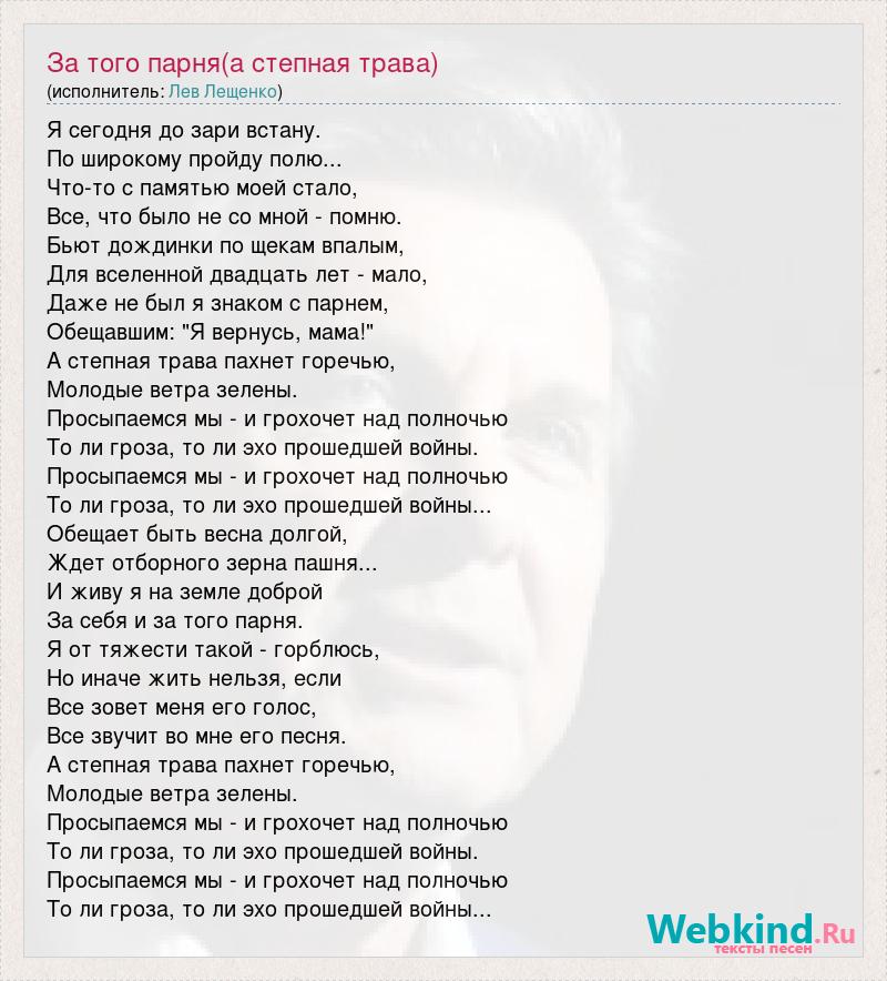 Я сегодня до зари встану. По широкому пройду полю... Что-то с памятью моей стало, Все, что было не со мной - помню. Бьют дождинки по щекам впалым, Для вселенной двадцать лет - мало, Даже не был я знаком с парнем, Обещавшим: "Я вернусь, мама!" А степная трава пахнет горечью, Молодые ветра зелены. Просыпаемся мы - и грохочет над полночью То ли гроза, то ли эхо прошедшей войны. Просыпаемся мы - и грохочет над полночью То ли гроза, то ли эхо прошедшей войны... Обещает быть весна долгой, Ждет отборного зерна пашня... И живу я на земле доброй За себя и за того парня. Я от тяжести такой - горблюсь, Но иначе жить нельзя, если Все зовет меня его голос, Все звучит во мне его песня. А степная трава пахнет горечью, Молодые ветра зелены. Просыпаемся мы - и грохочет над полночью То ли гроза, то ли эхо прошедшей войны. Просыпаемся мы - и грохочет над полночью То ли гроза, то ли эхо прошедшей войны...