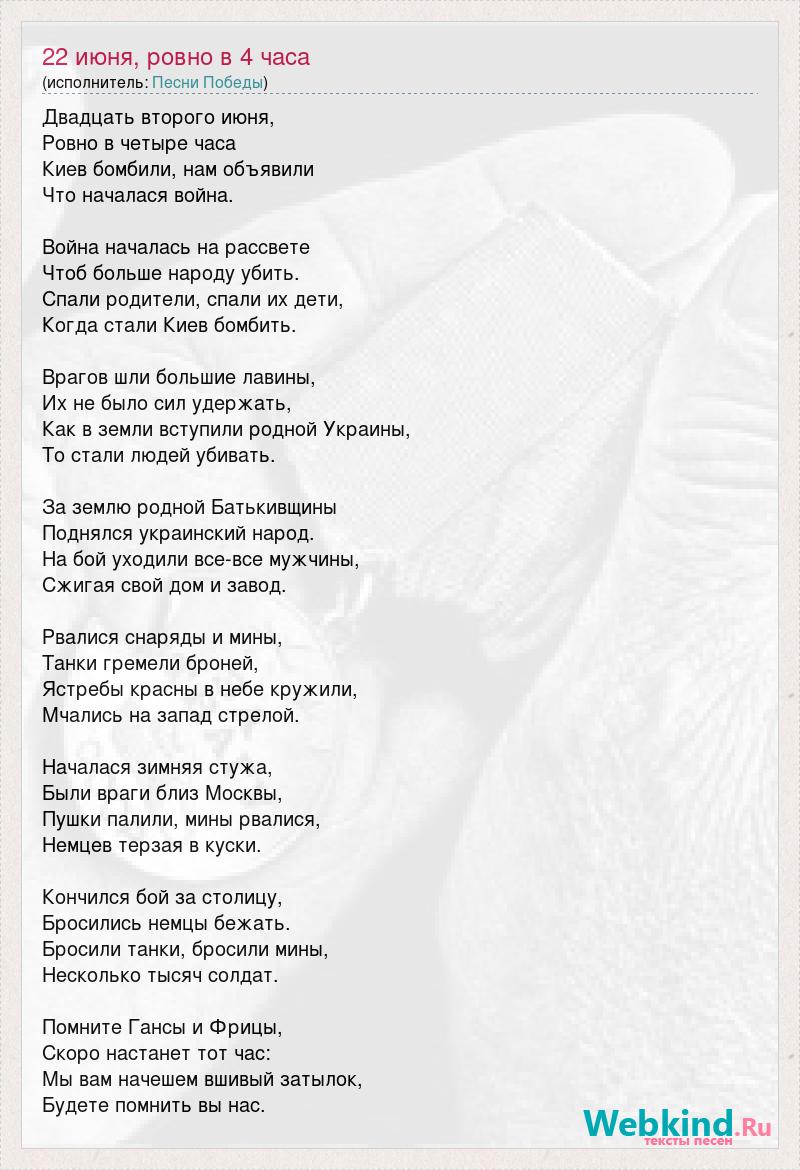 Двадцать второго июня, Ровно в четыре часа Киев бомбили, нам объявили Что началася война. Война началась на рассвете Чтоб больше народу убить. Спали родители, спали их дети, Когда стали Киев бомбить. Врагов шли большие лавины, Их не было сил удержать, Как в земли вступили родной Украины, То стали людей убивать. За землю родной Батькивщины Поднялся украинский народ. На бой уходили все-все мужчины, Сжигая свой дом и завод. Рвалися снаряды и мины, Танки гремели броней, Ястребы красны в небе кружили, Мчались на запад стрелой. Началася зимняя стужа, Были враги близ Москвы, Пушки палили, мины рвалися, Немцев терзая в куски. Кончился бой за столицу, Бросились немцы бежать. Бросили танки, бросили мины, Несколько тысяч солдат. Помните Гансы и Фрицы, Скоро настанет тот час: Мы вам начешем вшивый затылок, Будете помнить вы нас.