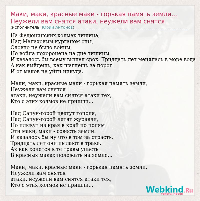 На Федюнинских холмах тишина, Над Малаховым курганом сны, Словно не было войны, Но война похоронена на дне тишины. И казалось бы всему вышел срок, Тридцать лет менялась в море вода А как выйдешь, как шагнешь за порог И от маков не уйти никуда. Маки, маки, красные маки - горькая память земли, Неужели вам снятся атаки, неужели вам снятся атаки тех, Кто с этих холмов не пришли... Над Сапун-горой цветут тополя, Над Сапун-горой летят журавли, Но плывут из края в край по полям Эти маки, маки - совесть земли. И казалось бы ну что в том за страсть, Тридцать лет они пылают в траве. Ах как хочется в те травы упасть В красных маках полежать на земле... Маки, маки, красные маки - горькая память земли, Неужели вам снятся атаки, неужели вам снятся атаки тех, Кто с этих холмов не пришли...