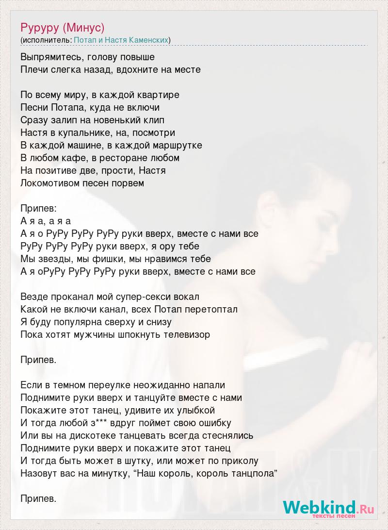 Выпрямитесь, голову повыше Плечи слегка назад, вдохните на месте По всему миру, в каждой квартире Песни Потапа, куда не включи Сразу залип на новенький клип Настя в купальнике, на, посмотри В каждой машине, в каждой маршрутке В любом кафе, в ресторане любом На позитиве две, прости, Настя Локомотивом песен порвем Припев: А я а, а я а А я о РуРу РуРу РуРу руки вверх, вместе с нами все РуРу РуРу РуРу руки вверх, я ору тебе Мы звезды, мы фишки, мы нравимся тебе А я оРуРу РуРу РуРу руки вверх, вместе с нами все Везде проканал мой супер-секси вокал Какой не включи канал, всех Потап перетоптал Я буду популярна сверху и снизу Пока хотят мужчины шпокнуть телевизор Припев. Если в темном переулке неожиданно напали Поднимите руки вверх и танцуйте вместе с нами Покажите этот танец, удивите их улыбкой И тогда любой з*** вдруг поймет свою ошибку Или вы на дискотеке танцевать всегда стеснялись Поднимите руки вверх и покажите этот танец И тогда быть может в шутку, или может по приколу Назовут вас на минутку, “Наш король, король танцпола” Припев.
