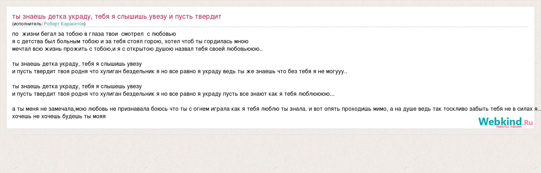 по жизни бегал за тобою в глаза твои смотрел с любовью я с детства был больным тобою и за тебя стоял горою, хотел чтоб ты гордилась мною мечтал всю жизнь прожить с тобою,и я с открытою душою назвал тебя своей любовьююю.. ты знаешь детка украду, тебя я слышишь увезу и пусть твердит твоя родня что хулиган бездельник я но все равно я украду ведь ты же знаешь что без тебя я не могууу.. ты знаешь детка украду, тебя я слышешь увезу и пусть твердит твоя родня что хулиган бездельник я но все равно я украду пусть все знают как я тебя люблюююю... а ты меня не замечала,мою любовь не признавала боюсь что ты с огнем играла как я тебя люблю ты знала. и вот опять проходишь мимо, а на душе ведь так тоскливо забыть тебя не в силах я.. хочешь не хочешь будешь ты мояя