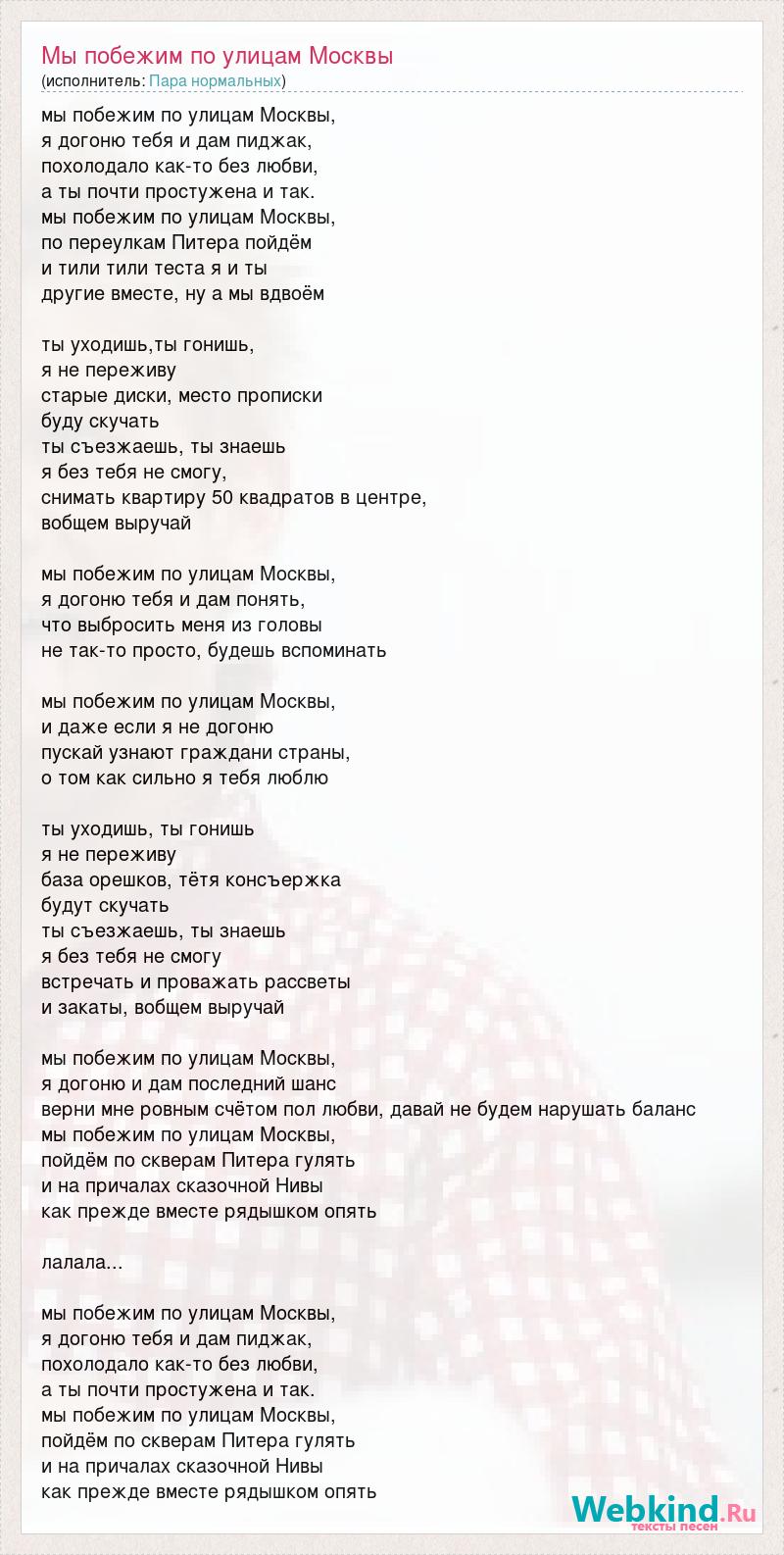 мы побежим по улицам Москвы, я догоню тебя и дам пиджак, похолодало как-то без любви, а ты почти простужена и так. мы побежим по улицам Москвы, по переулкам Питера пойдём и тили тили теста я и ты другие вместе, ну а мы вдвоём ты уходишь,ты гонишь, я не переживу старые диски, место прописки буду скучать ты съезжаешь, ты знаешь я без тебя не смогу, снимать квартиру 50 квадратов в центре, вобщем выручай мы побежим по улицам Москвы, я догоню тебя и дам понять, что выбросить меня из головы не так-то просто, будешь вспоминать мы побежим по улицам Москвы, и даже если я не догоню пускай узнают граждани страны, о том как сильно я тебя люблю ты уходишь, ты гонишь я не переживу база орешков, тётя консъержка будут скучать ты съезжаешь, ты знаешь я без тебя не смогу встречать и проважать рассветы и закаты, вобщем выручай мы побежим по улицам Москвы, я догоню и дам последний шанс верни мне ровным счётом пол любви, давай не будем нарушать баланс мы побежим по улицам Москвы, пойдём по скверам Питера гулять и на причалах сказочной Нивы как прежде вместе рядышком опять лалала... мы побежим по улицам Москвы, я догоню тебя и дам пиджак, похолодало как-то без любви, а ты почти простужена и так. мы побежим по улицам Москвы, пойдём по скверам Питера гулять и на причалах сказочной Нивы как прежде вместе рядышком опять